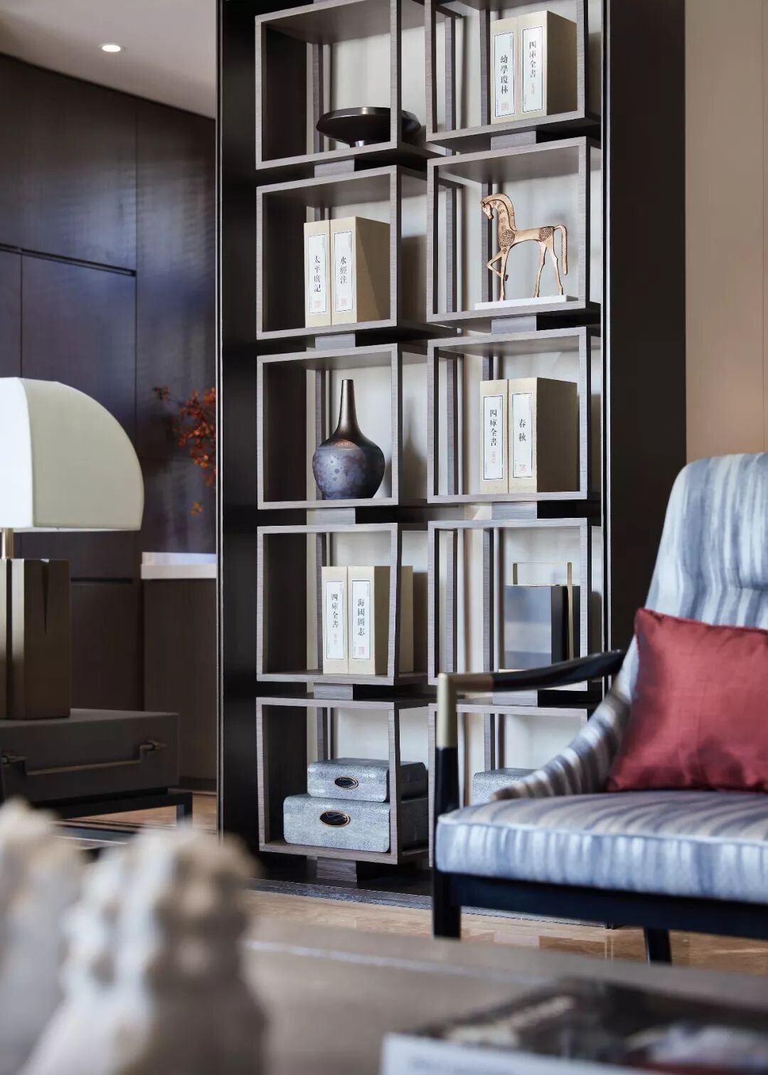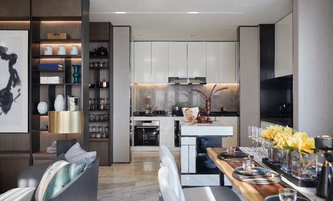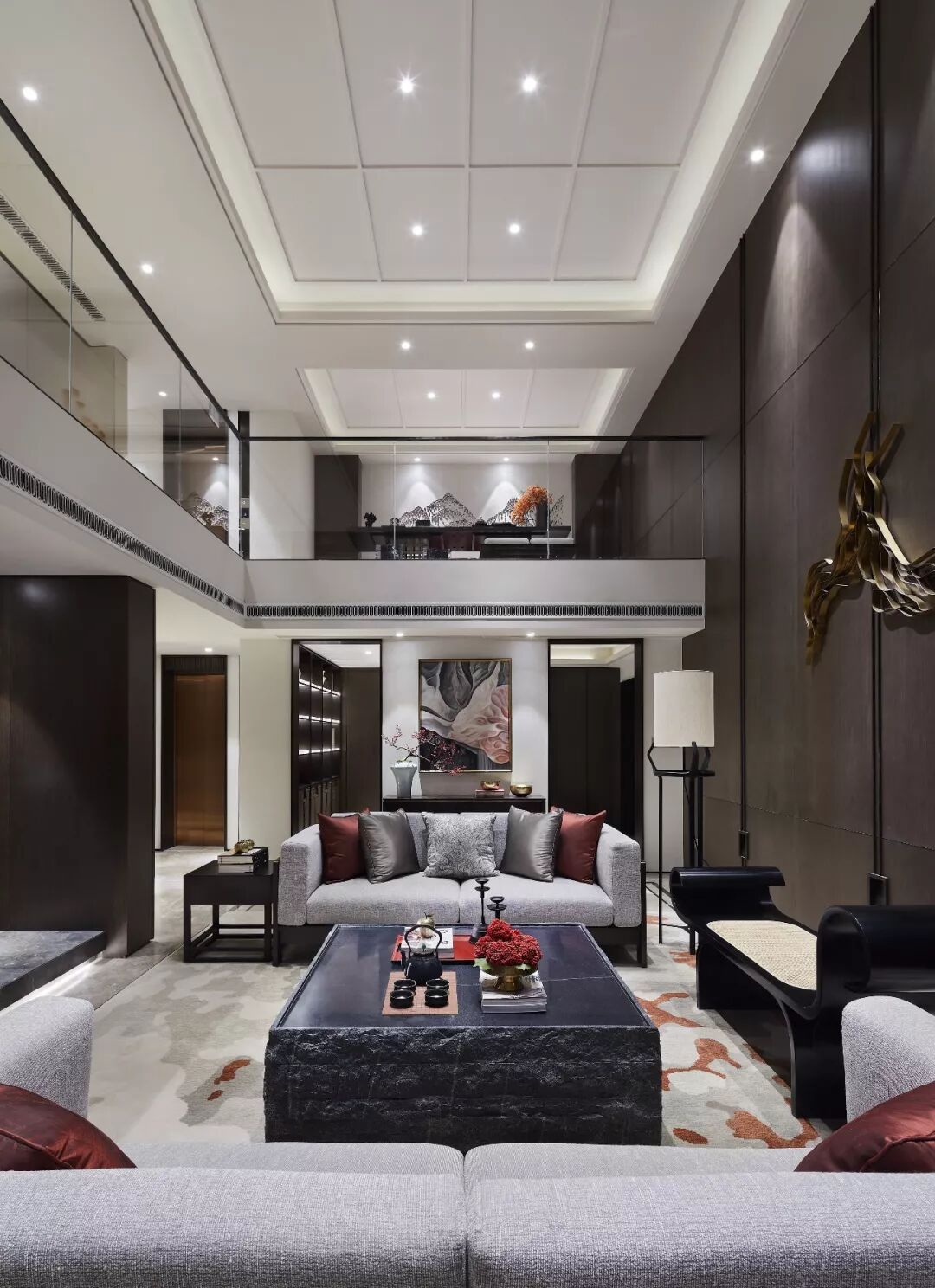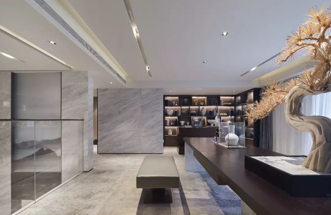 用现代气质营造意境,让空间显得更通透旷达,配合整体的深色调,更显沉稳大气,犹如一副泼墨的山水画,给人飘逸的东方韵味。