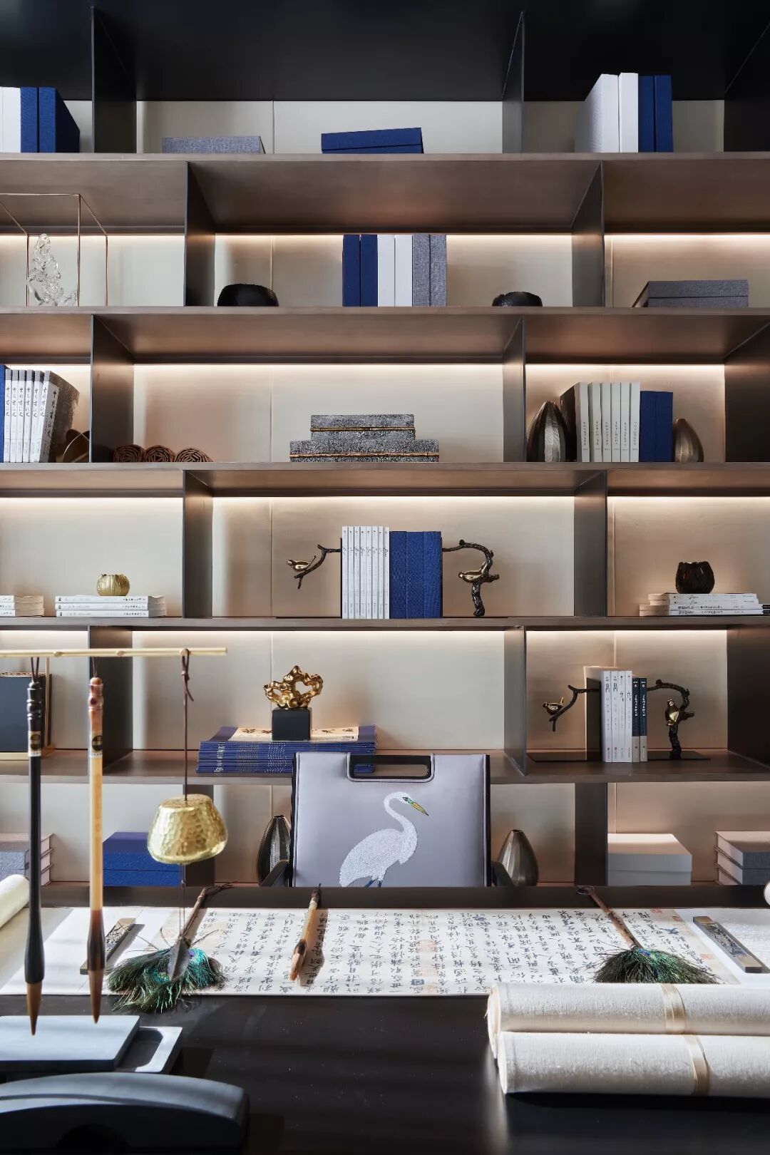 用诗学充满空间,自然搭配色彩,在不同的手法下呈现出一股清澈的文学气质。仙鹤图纹传达出空灵之美,至此远离都市的喧嚣。