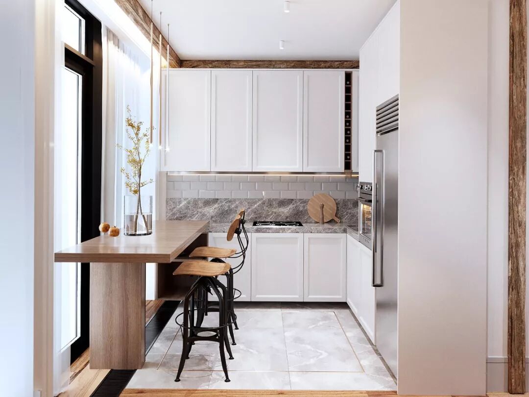 在L型厨房中设置一个简易的小吧台,