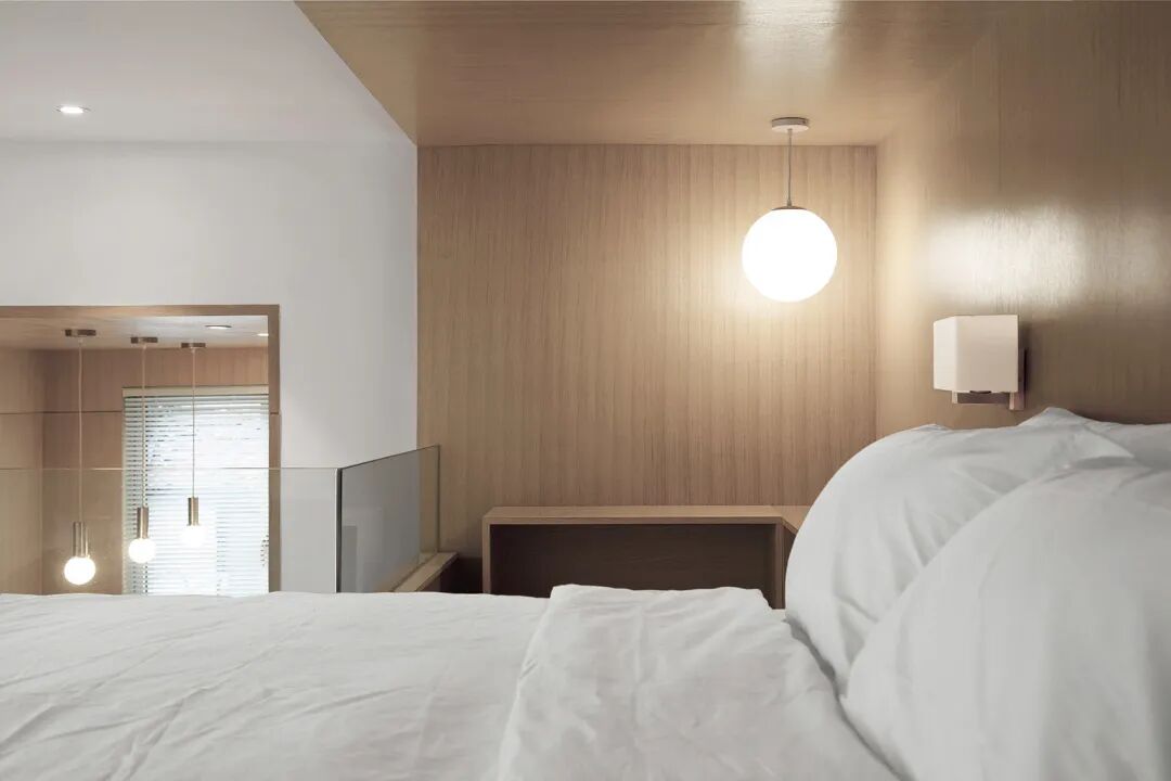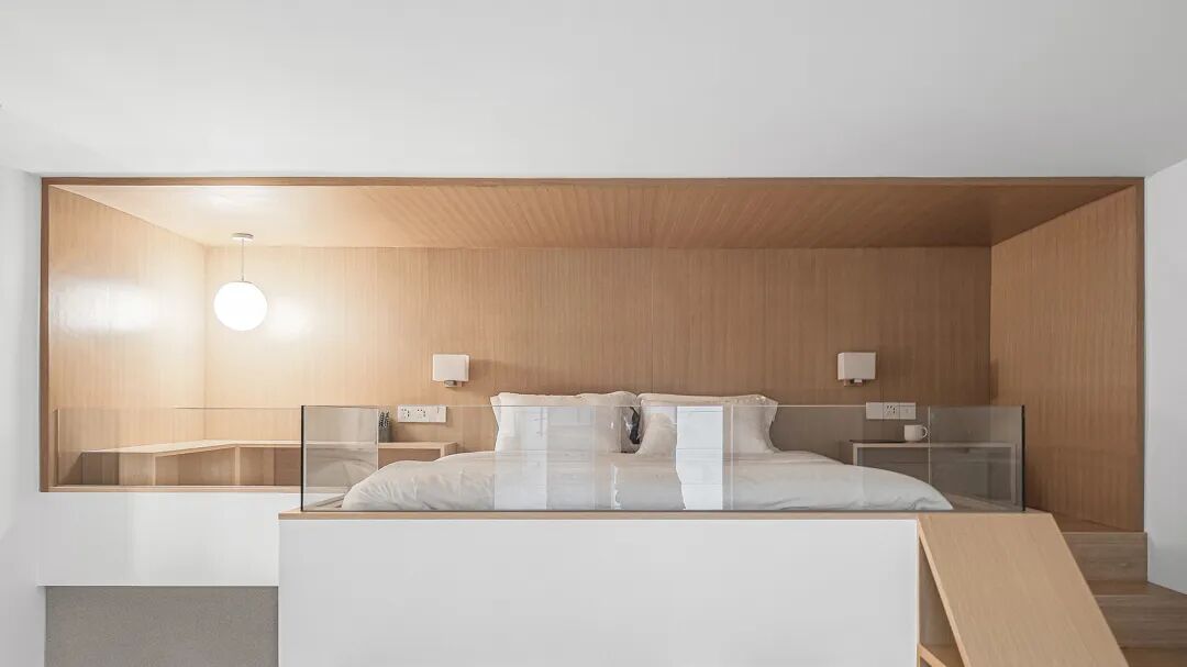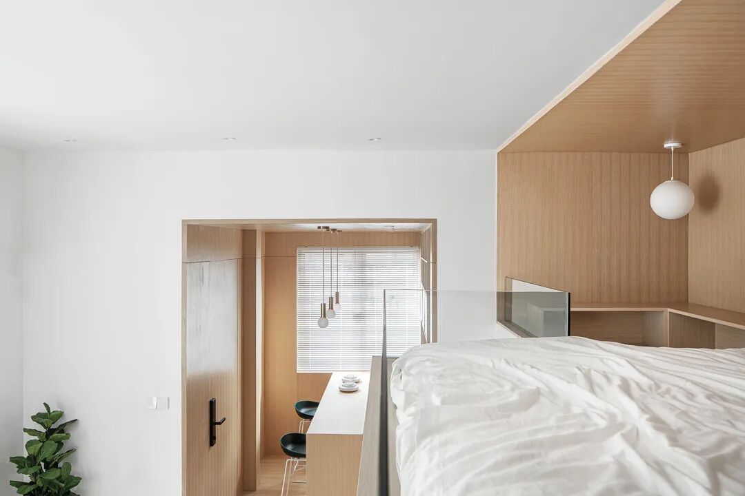 夹层卧室:夹层为卧室区域,由于层高限制,床垫直接铺在地板上。在床两侧设置的固定家具丰富了夹层的使用功能,也限定出与下方空间互不打扰的区域。