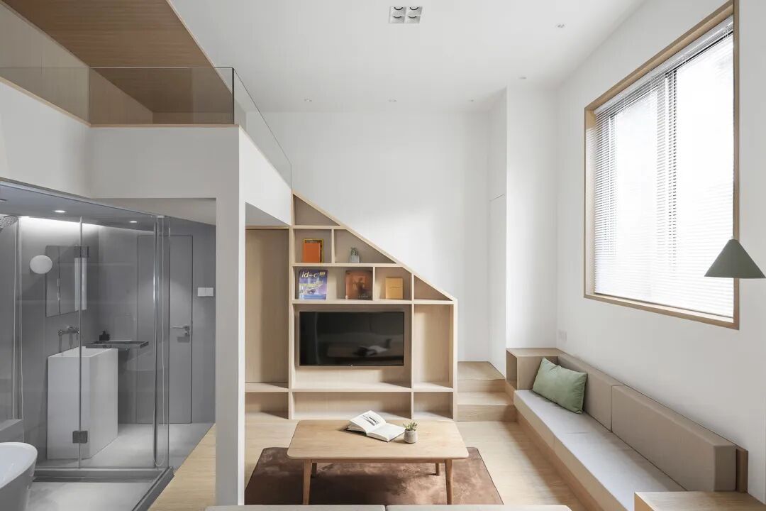 在多年的产权分割后套内面积仅剩25平方米。新的业主希望将其改造成短租民宿。设计师围绕“如何在25平方米的空间内营造一个温馨、舒适且能容纳多种活动的场所。”这一设计目标开展设计。通过建立室内外的连接、利用夹层以及功能叠加等方式充分挖掘了该极小户型的空间潜能,始终打造了一个居住功能完备且能承载多人聚会的丰富空间。