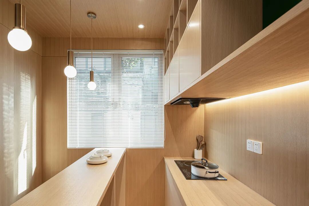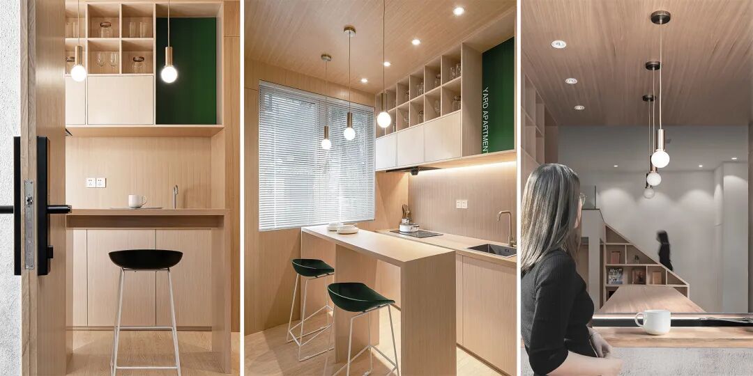 由于民宿对于烹饪的需求不高,原本功能性很强的厨房被弱化,这对于功能的复合叠加提供了机会。正对入户门的区域叠加了三种功能:玄关、吧台、厨房。橱柜中的酒杯、组成序列的吊灯、吧台和高凳营造出街边咖啡厅般的温馨氛围。这一场景提升了住户的入户体验,也提供了独立的就餐以及临时办公区域。