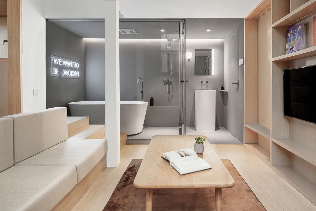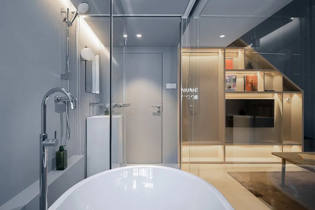 卫浴区域:卫浴区域占满整个夹层下方空间。平时台盆区、沐浴区完全面向起居室敞开,仅用玻璃隔断进行空间分割,必要时可放下浴帘遮挡隐私。被水泥漆包裹的暗色调卫浴区在精心营造的照明下带给住客静谧、放松之感。虽然整户面积较小,但是依然设置了标准浴缸,使沐浴体验更加完整。使用浴缸时透过一整块玻璃隔断可以直接看到电视画面。