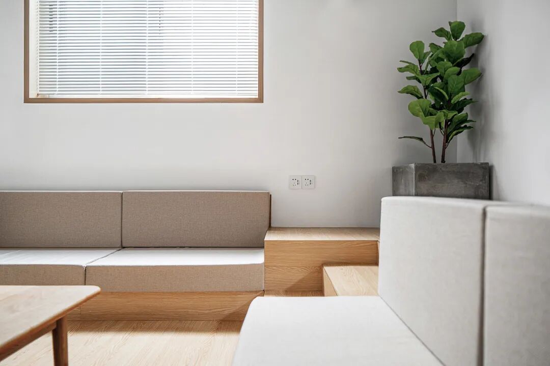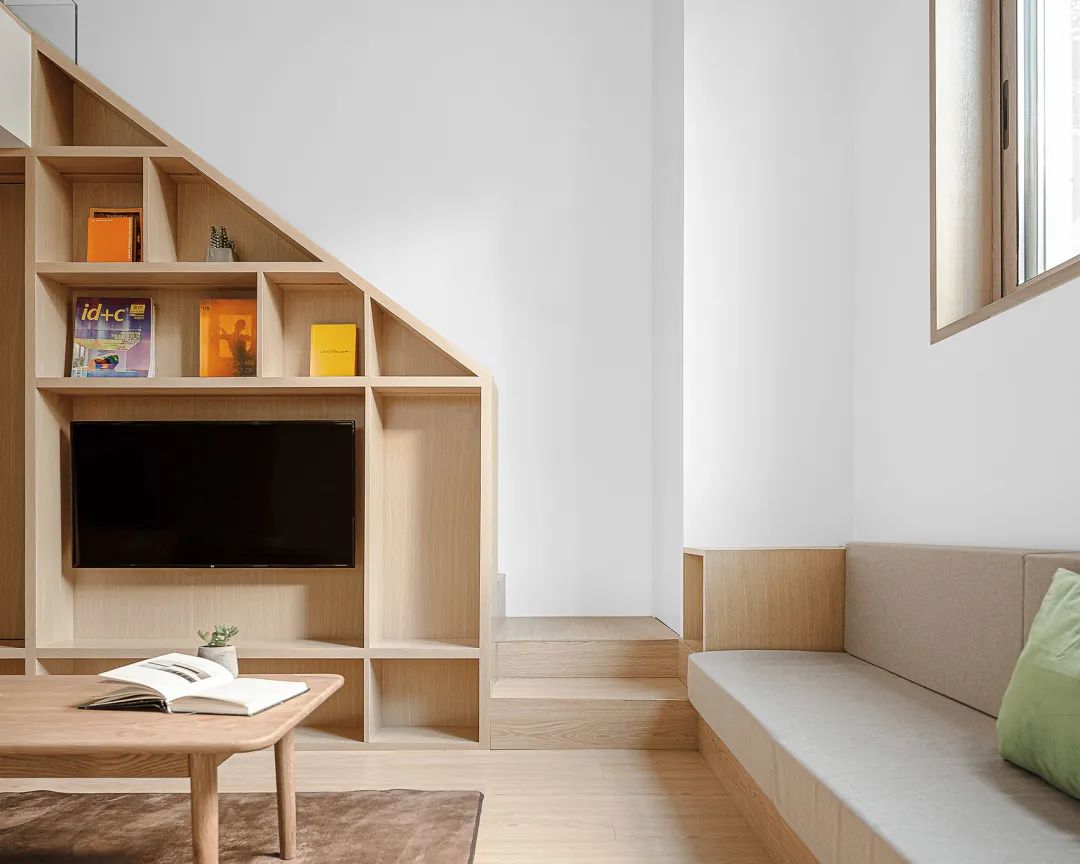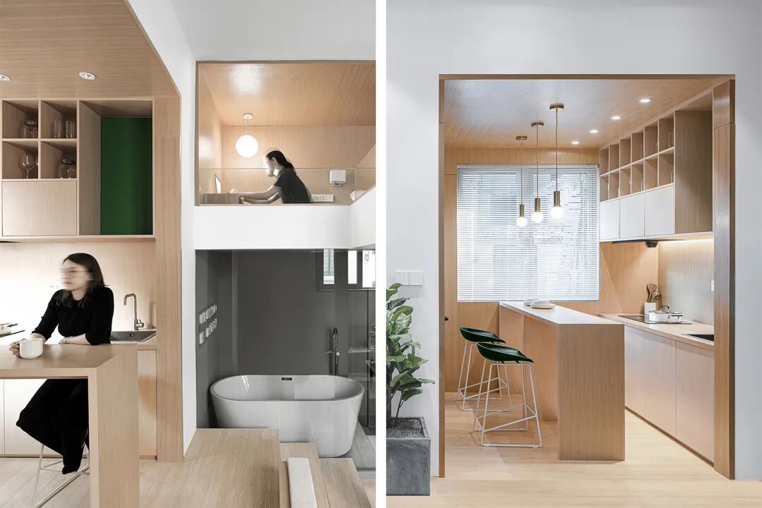 半下沉起居室:改造前,地面被整体垫高45公分,只有卫生间区在原始正负零标高。在改造时,设计师保留了入户厨房区的垫层,将起居区域、卫生间区域的地面降到原始标高。起居区域形成一个具有围合感的半下沉空间。高差营造出丰富的空间感受。踏步两侧被定义为沙发,楼梯扶手同时充当书架和衣柜。木饰面以及木质家具为空间带来亲和力,家具与建筑的界限变得模糊,这样有利于充分利用每一处空间。