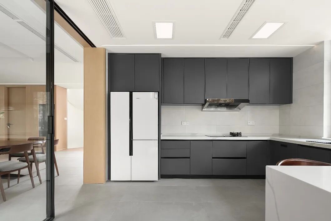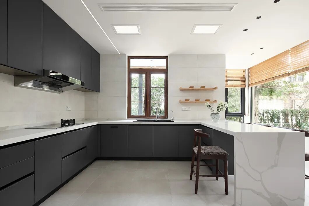 厨房和餐厅是精致生活的一种重要表达方式。高级灰的橱柜与素雅的瓷砖搭配,大理石纹理的吧台和窗外的阳光与绿色给早餐及制作点心带来更美好的心情。