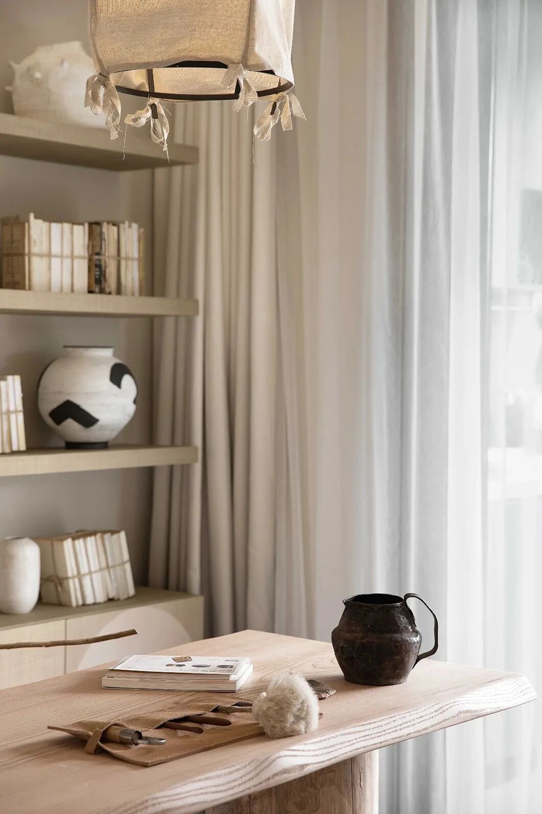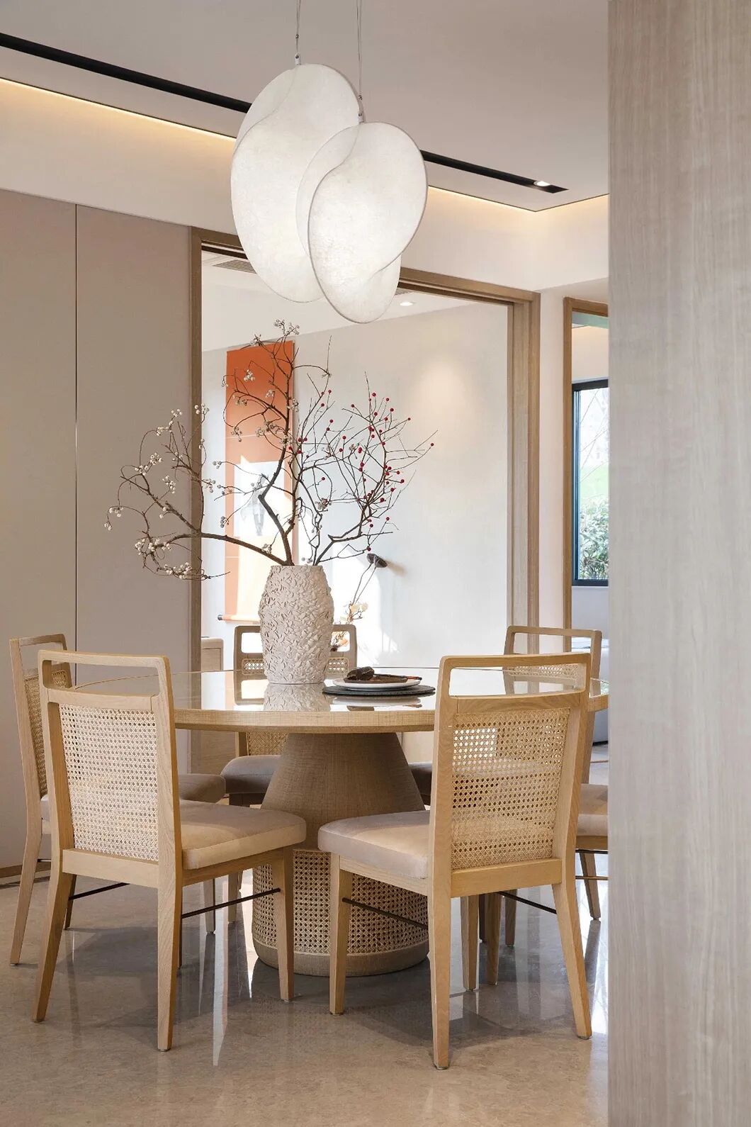 原木餐桌、藤编餐椅、和纸造型的吊灯,闲适清淡,令人对每日三餐的美好盛筵新生向往。