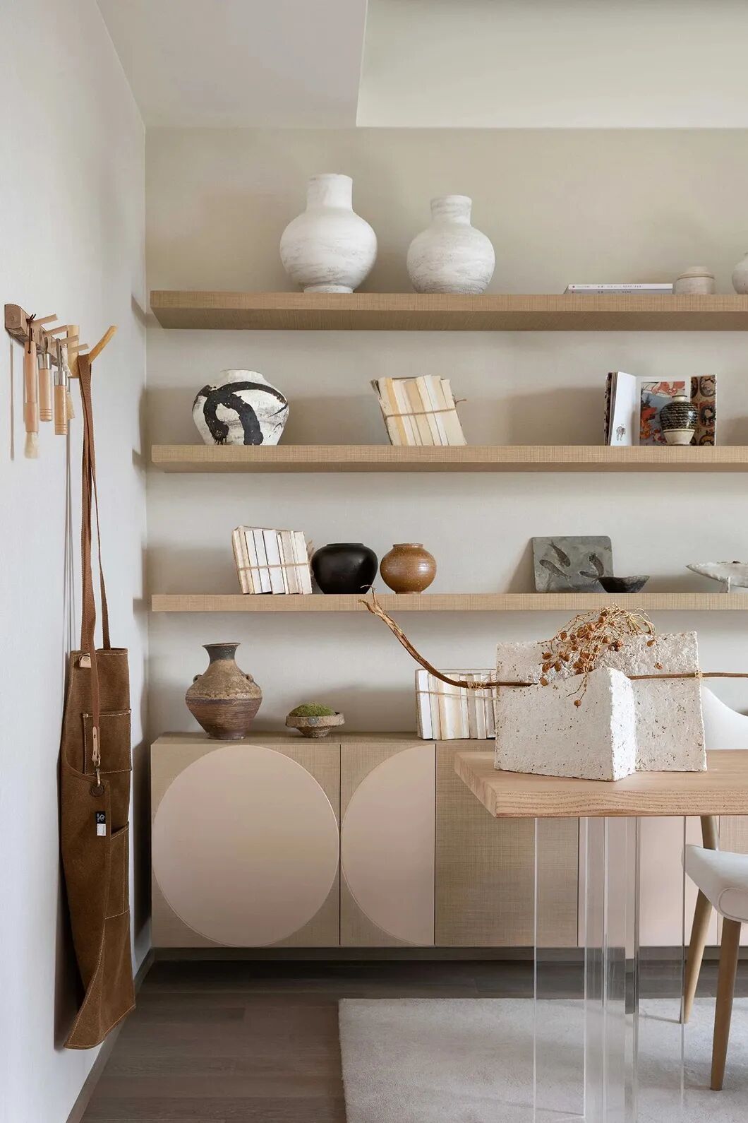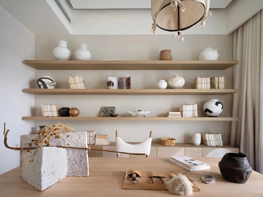 大量留白的空间让视觉放松下来,原木色的搁架与工作桌质朴无华,精挑细选的瓷器摆件充满了文人墨客的情调,在瞬间便将现代社会快节奏的烦扰褪去一二,在家中为自己觅得一方精神绿洲。
