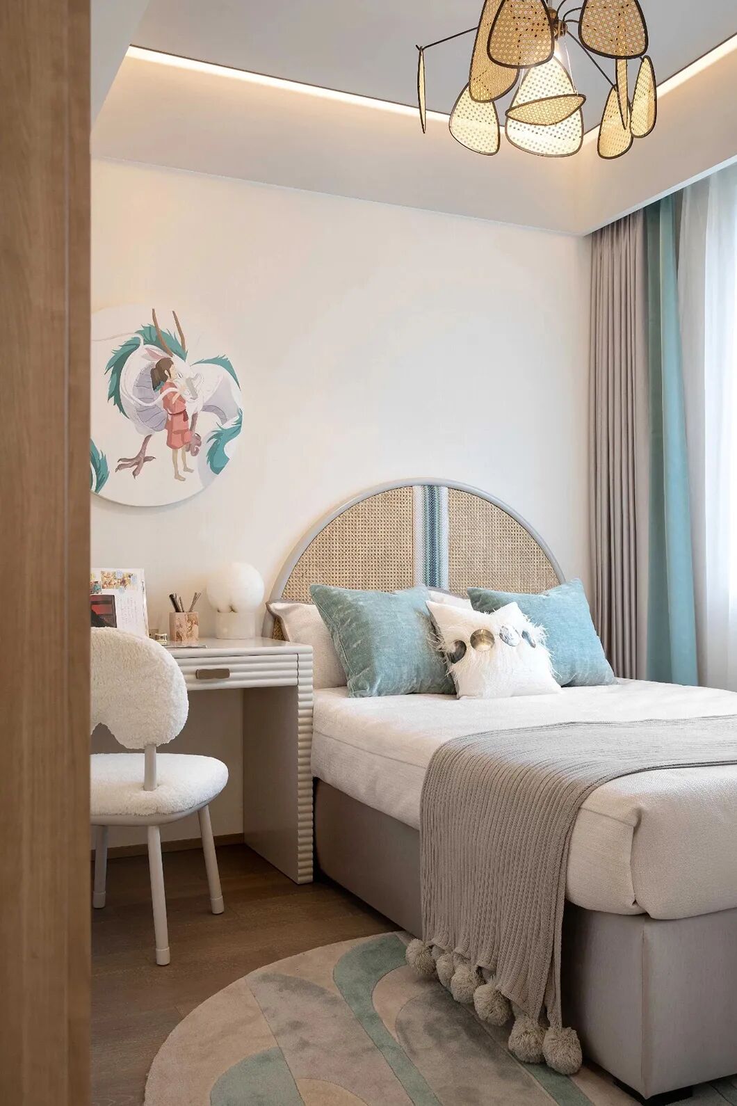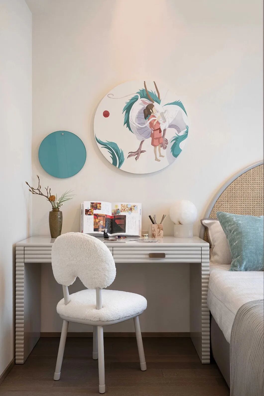 在宽裕的阳台空间,设计师打造出一片小绿洲,眼之所及,耳之所闻,都是一份轻松惬意。家居呼应了空间的原木色,自然地延伸了从内到外的空间过渡。童趣四溢的女儿房,以千与千寻的童真融化少女心。清新的蓝绿与质朴的灰白亦能完美融合。
