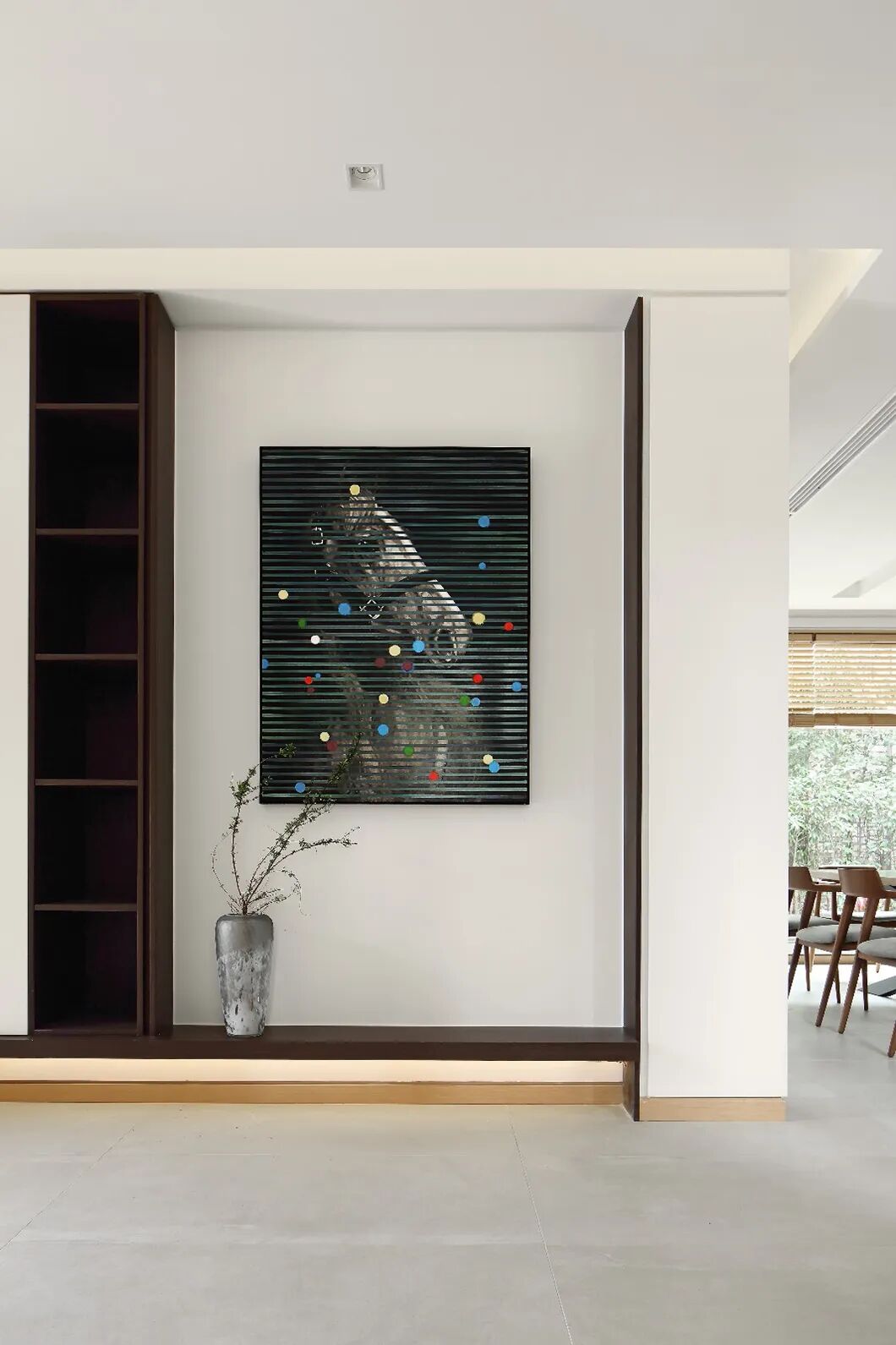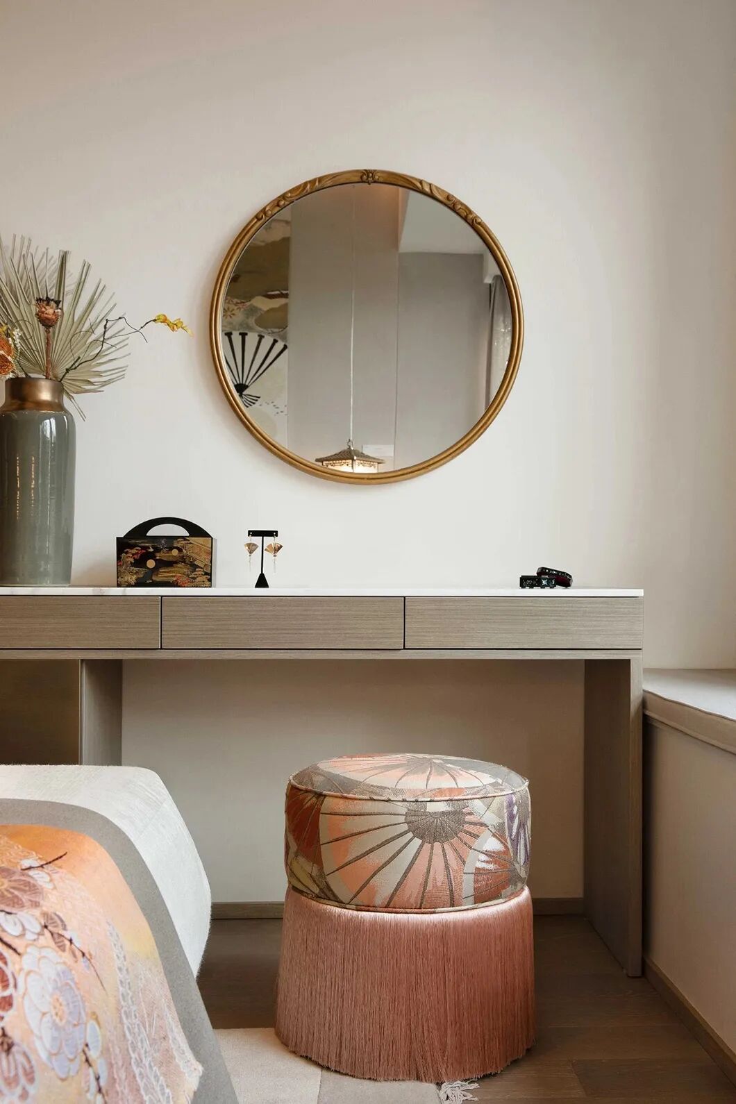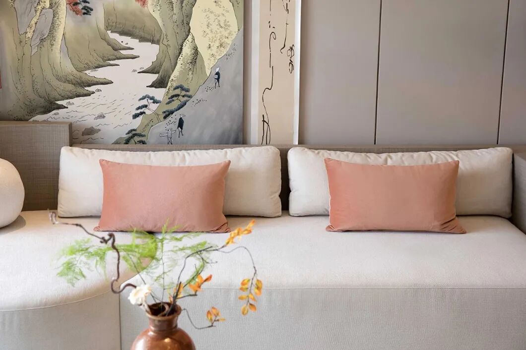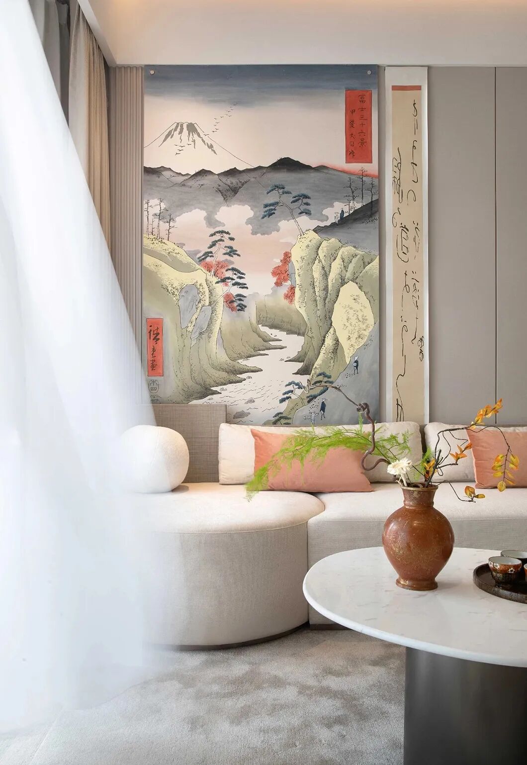 灰白,奠定了清冷之调,跳跃其间的蔷薇色带来愉悦之感;借由半墙的浮世绘画、精致的盆景其器皿,在细节处勾勒出主人雅致的简约美学和生活方式。