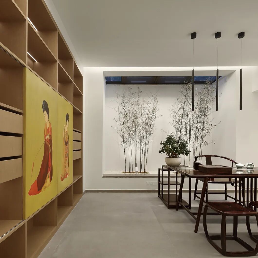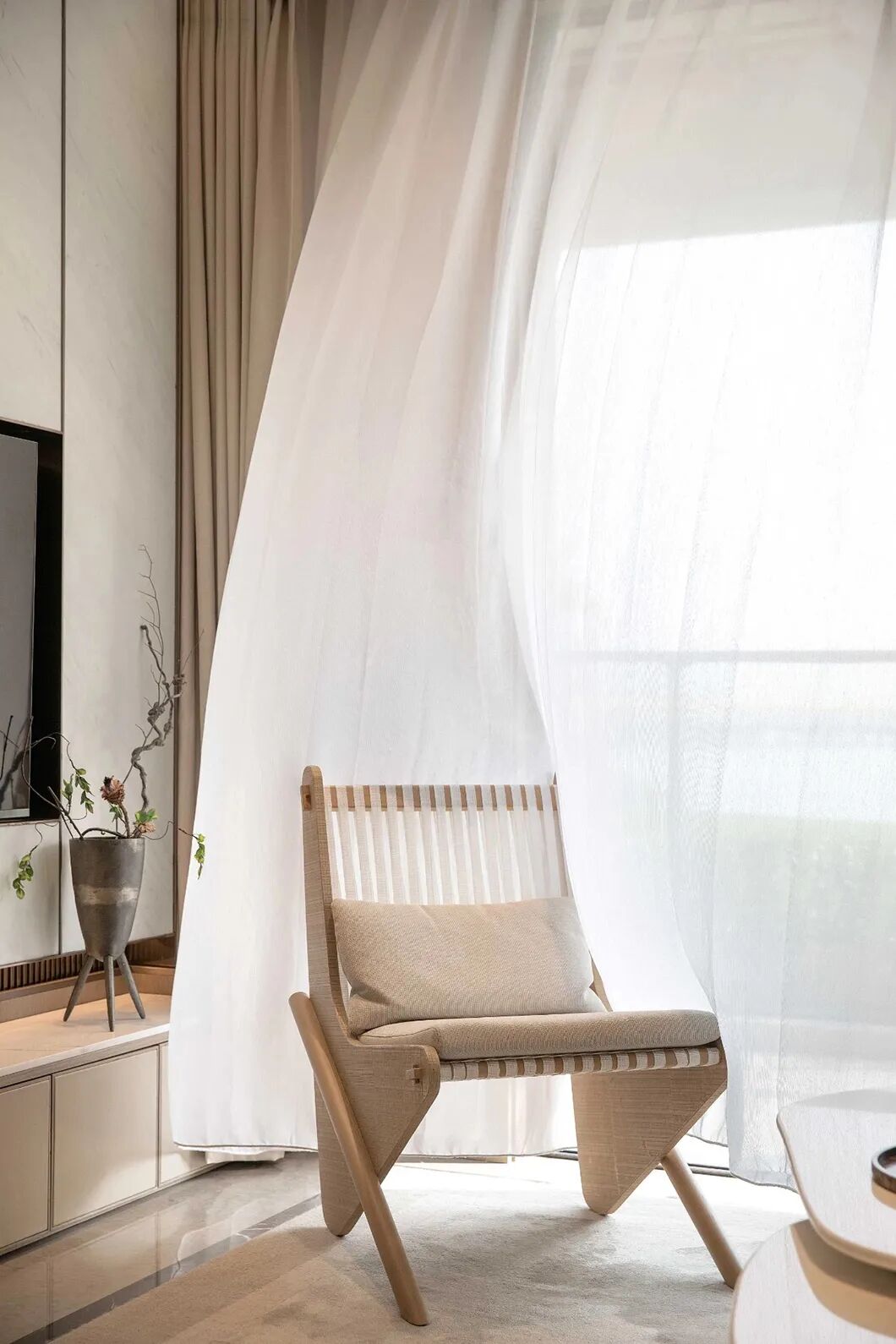 地下一层茶室的设计颇有禅意。空间上没有过多的修饰,素雅自然。家具的选择尤其注重工艺和材质,内敛的气质与空间相得益彰。原木色系的家居和大面积的留白让整个空间显得沉稳而宁静,而当你进入这个空间体验时,又能感知其中的细腻和优雅。