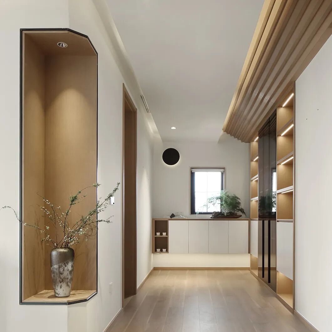 别墅进门玄关设置在客厅南端,墙面通过方圆结合的窗体形成立面造型,同时营造出不同的光影效果。让空间开放,让视觉延伸,让胸怀开阔,这是我对玄关的一种表达。