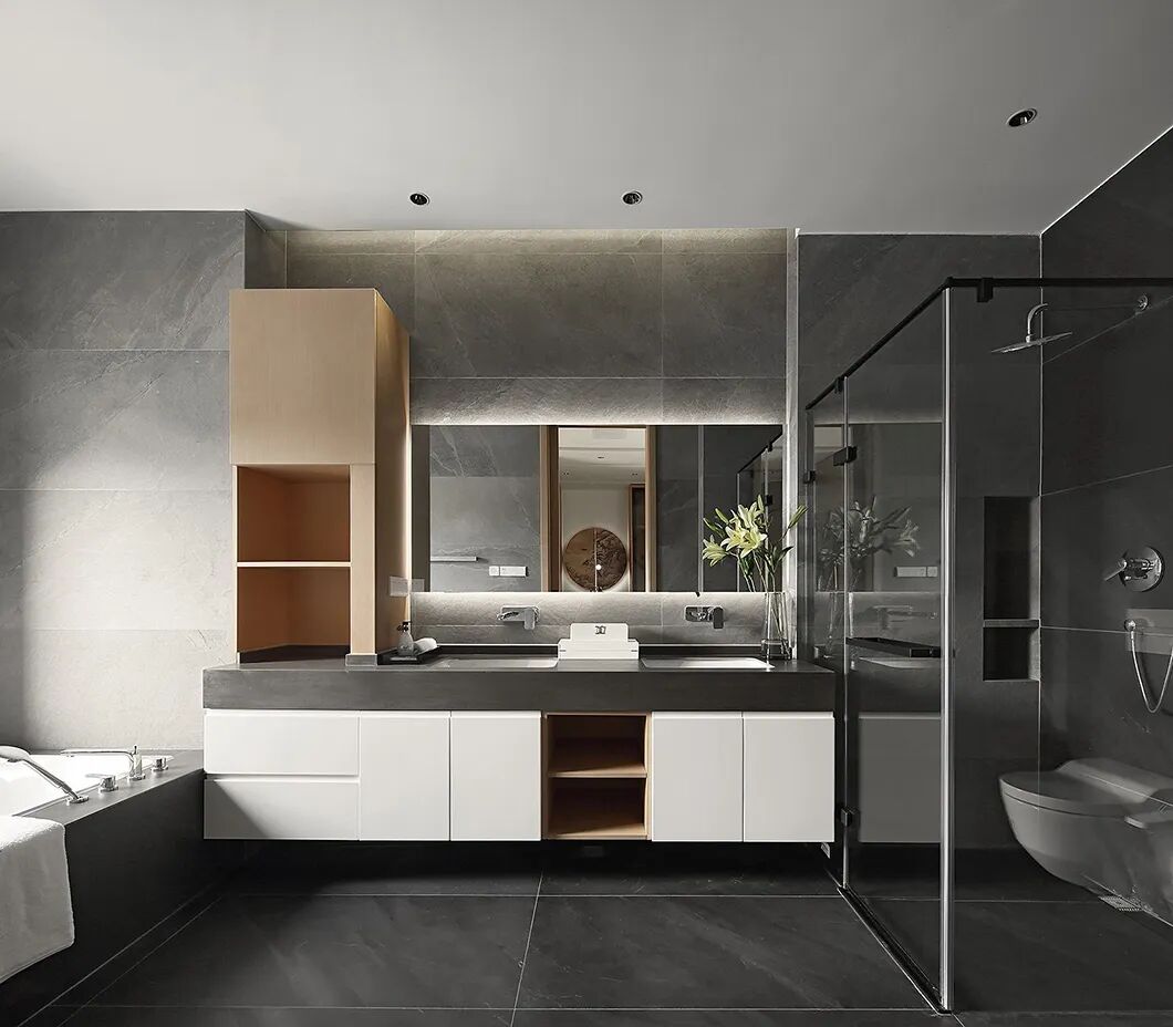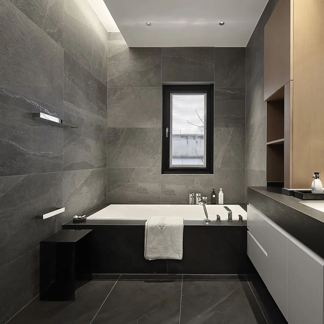 卫生间简洁的直线造型营造出带有序列感的平面视觉。火山岩的灰色墙地砖与黑色的火山岩砖背景,自然地融和。