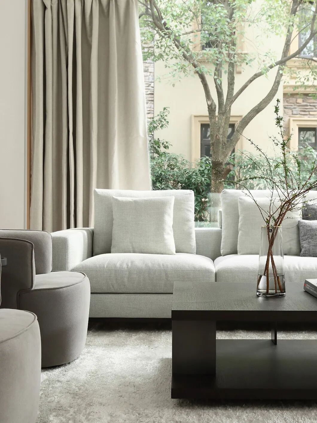 想象一下:周末的午后,女主人坐在温馨的布艺沙发上,透过落地玻璃看着花园里老公和孩子在一起玩耍,她的脸上洋溢着甜甜的笑容。我想,这或许就是简单的幸福吧。