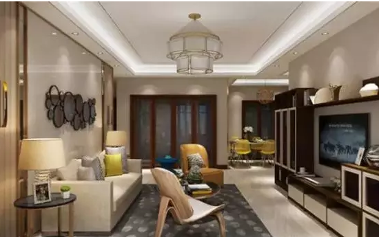 通透式的布局,玻璃门让客厅空间得到延伸,咖啡色简约线条的电视柜配以米白色的布艺沙发、黄色的皮沙发和原木小椅,整个空间时尚清新有活力。