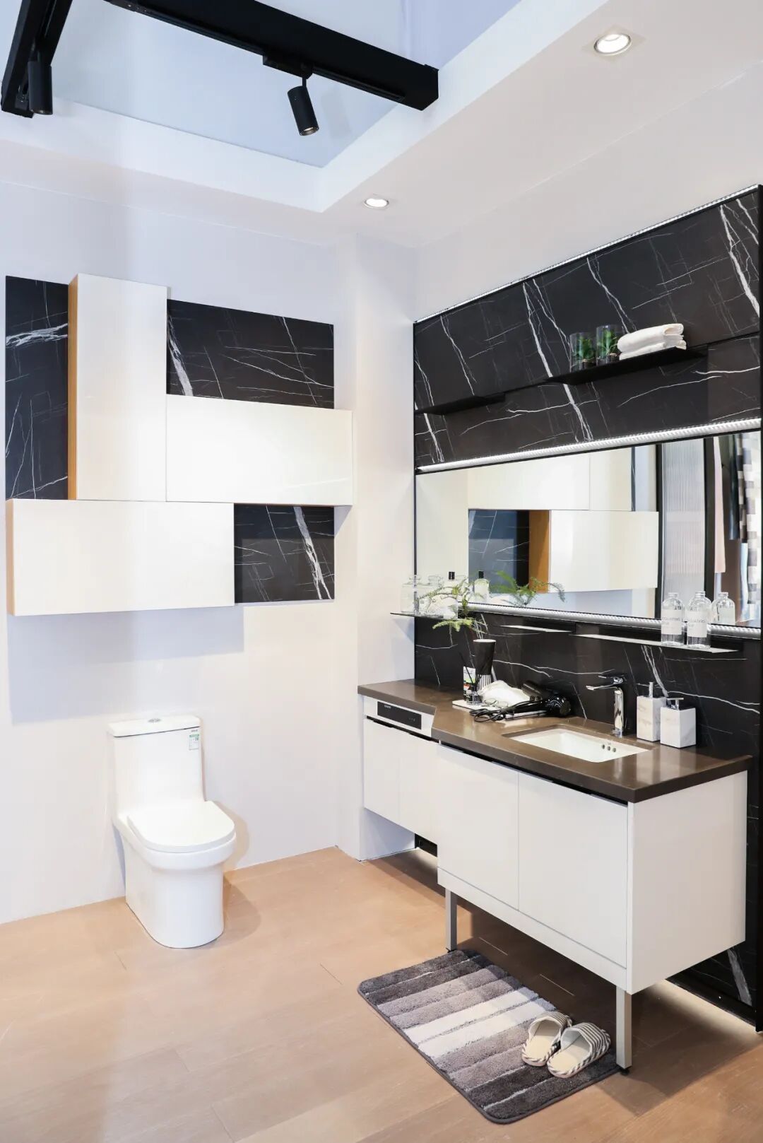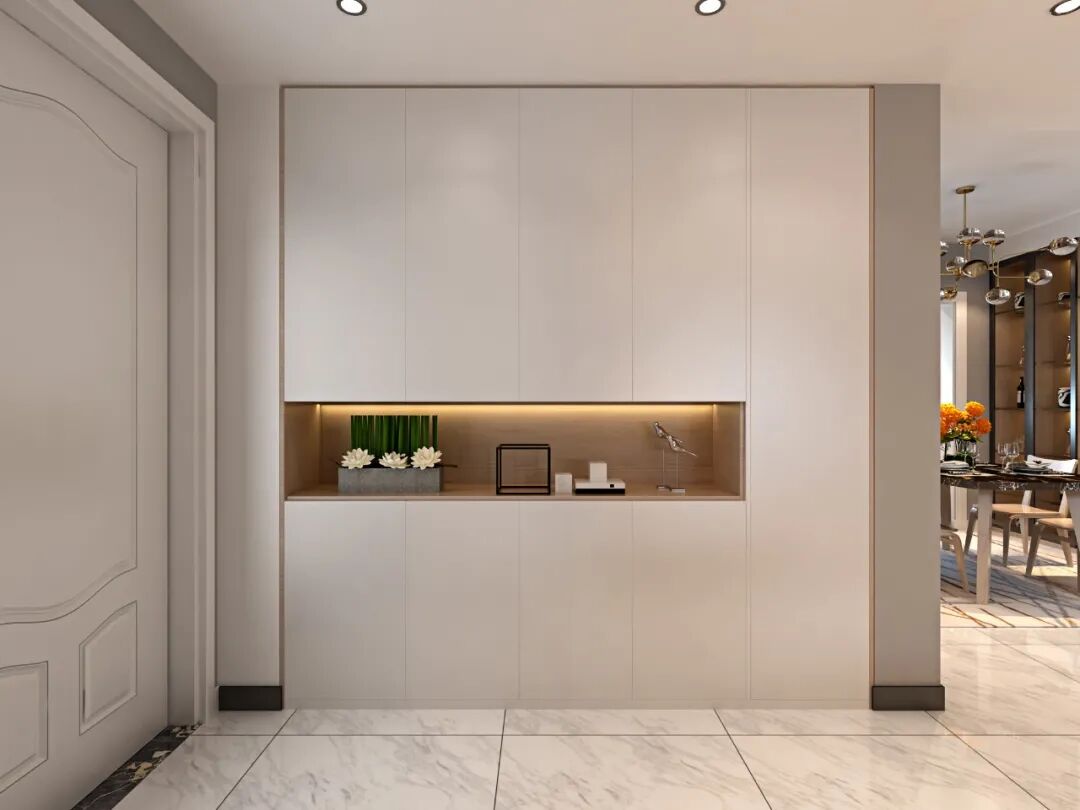 柜体灯带也是非常常见的一种运用方式,最普遍的做法是在柜子的层架内侧安置灯带,这种方式能够映照柜子的内部轮廓,以及层架上摆件,很容易创造出化平庸为神奇的效果。