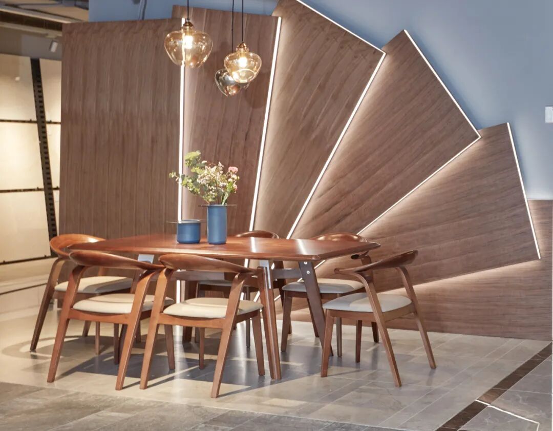 在灯带的衬托下,木材的轮廓和扇形展开的布置方式被清晰点亮,带来更好的展示效果。