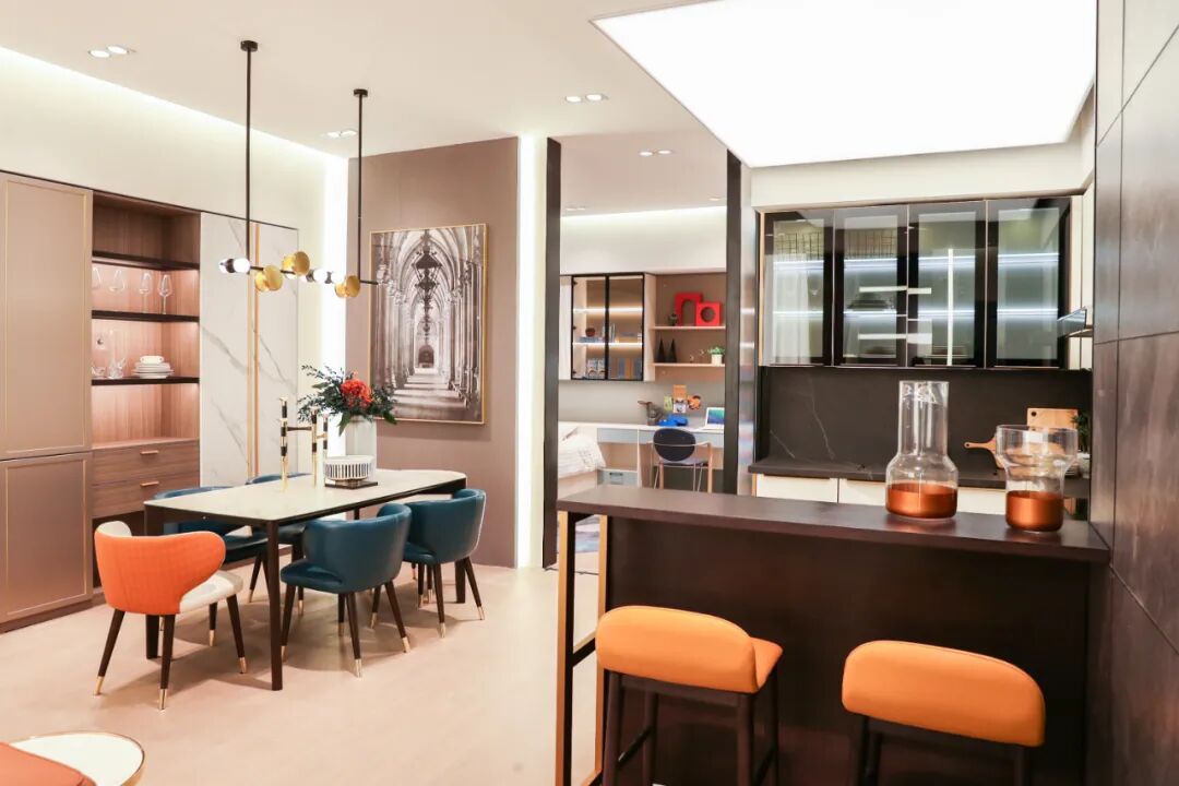 在这个简餐料理台和餐厅合一的开放区域,吊顶、餐边柜和吊柜都使用了灯带,亮晶晶的效果美轮美奂,仿佛置身于一片光的海洋。
