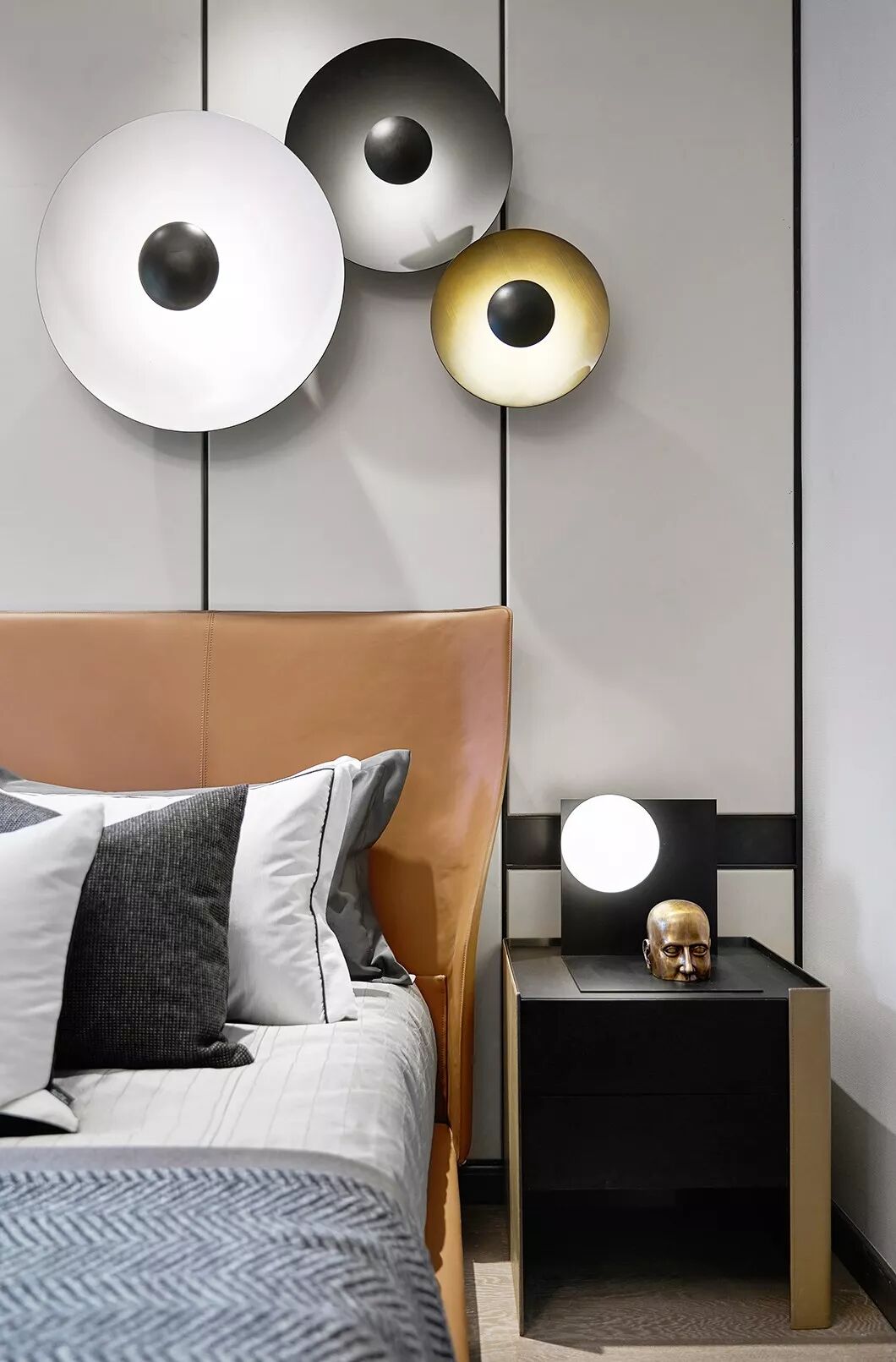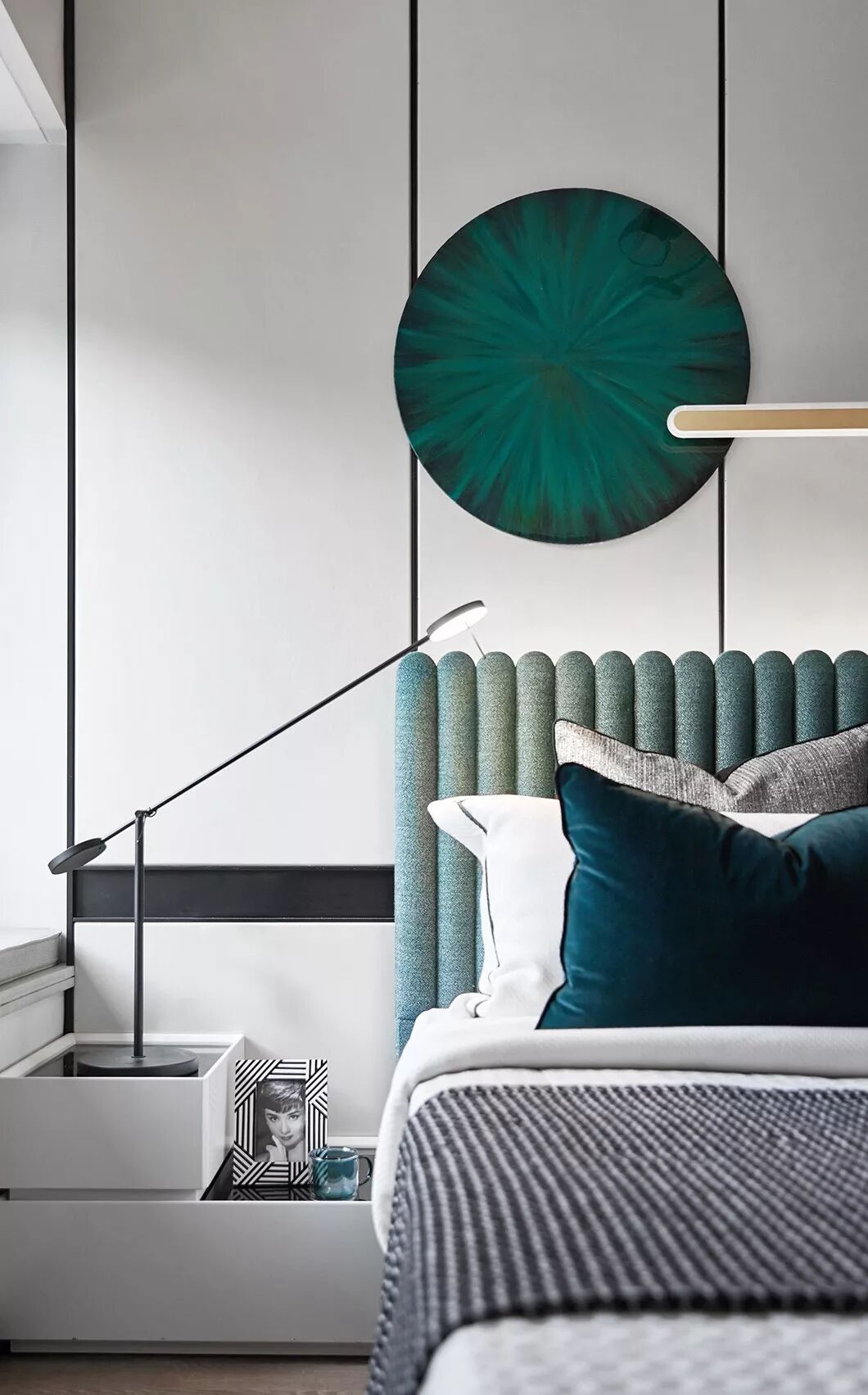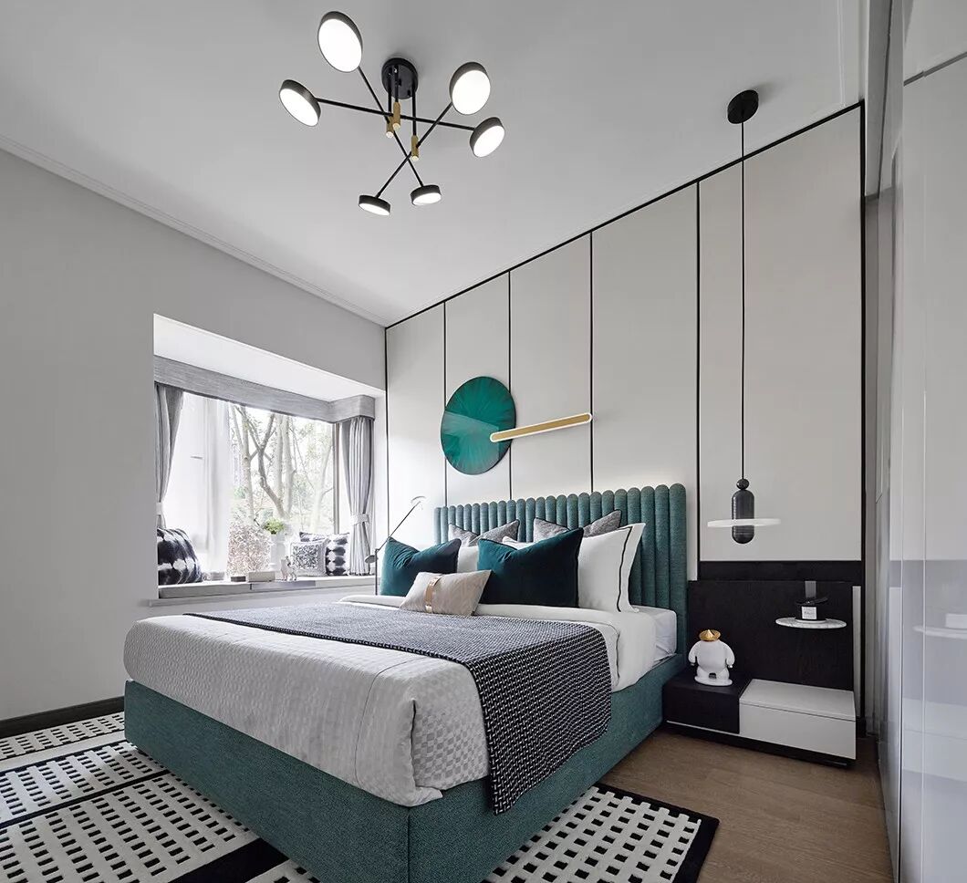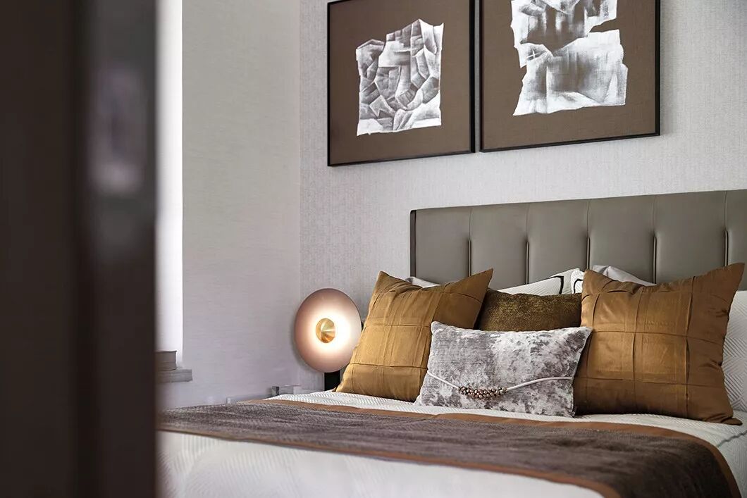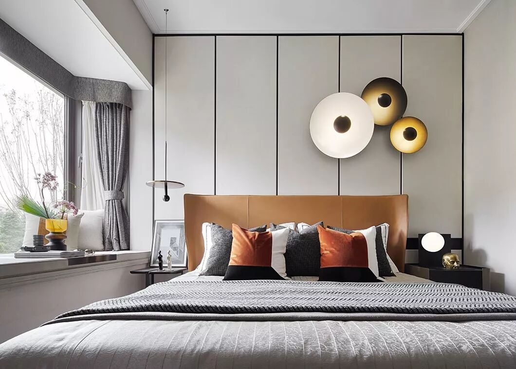 主卧空间中使用简约内敛的高级灰作为主色调使人沉淀心灵,绿色是贯穿空间的点缀色,配以舒适温柔的床品,艺术品的穿插、融合打破了空间的平淡乏味,每一处都彰显着居住者优雅的生活状态与情调。