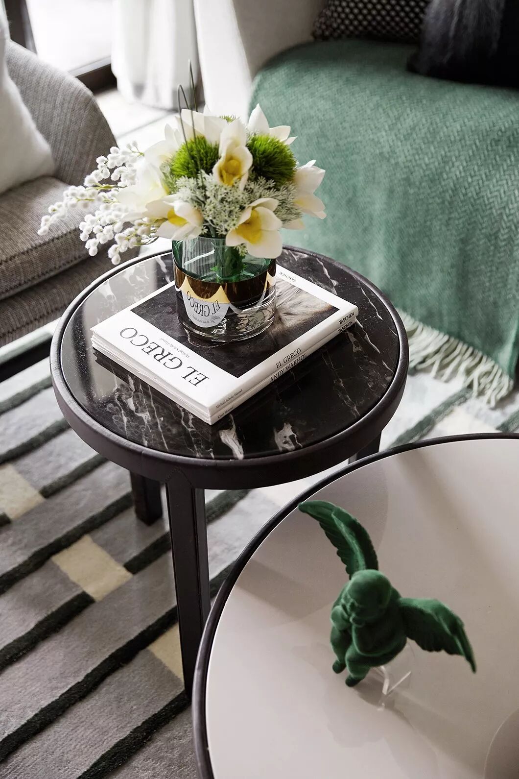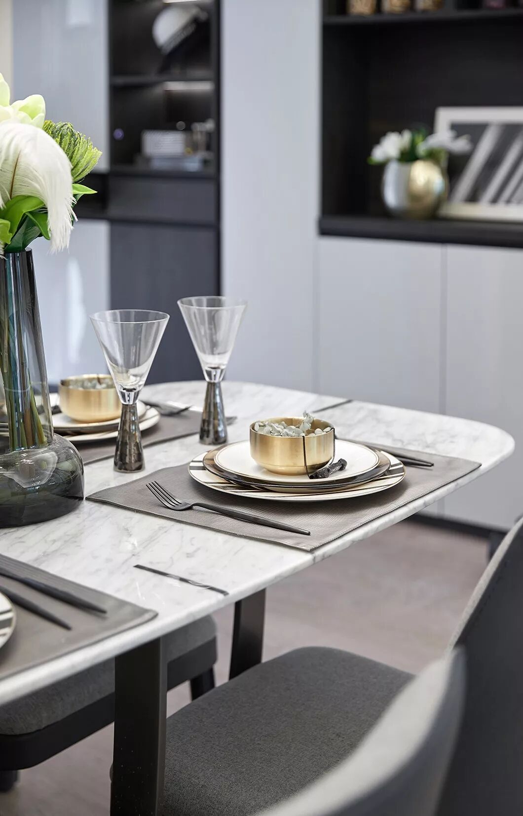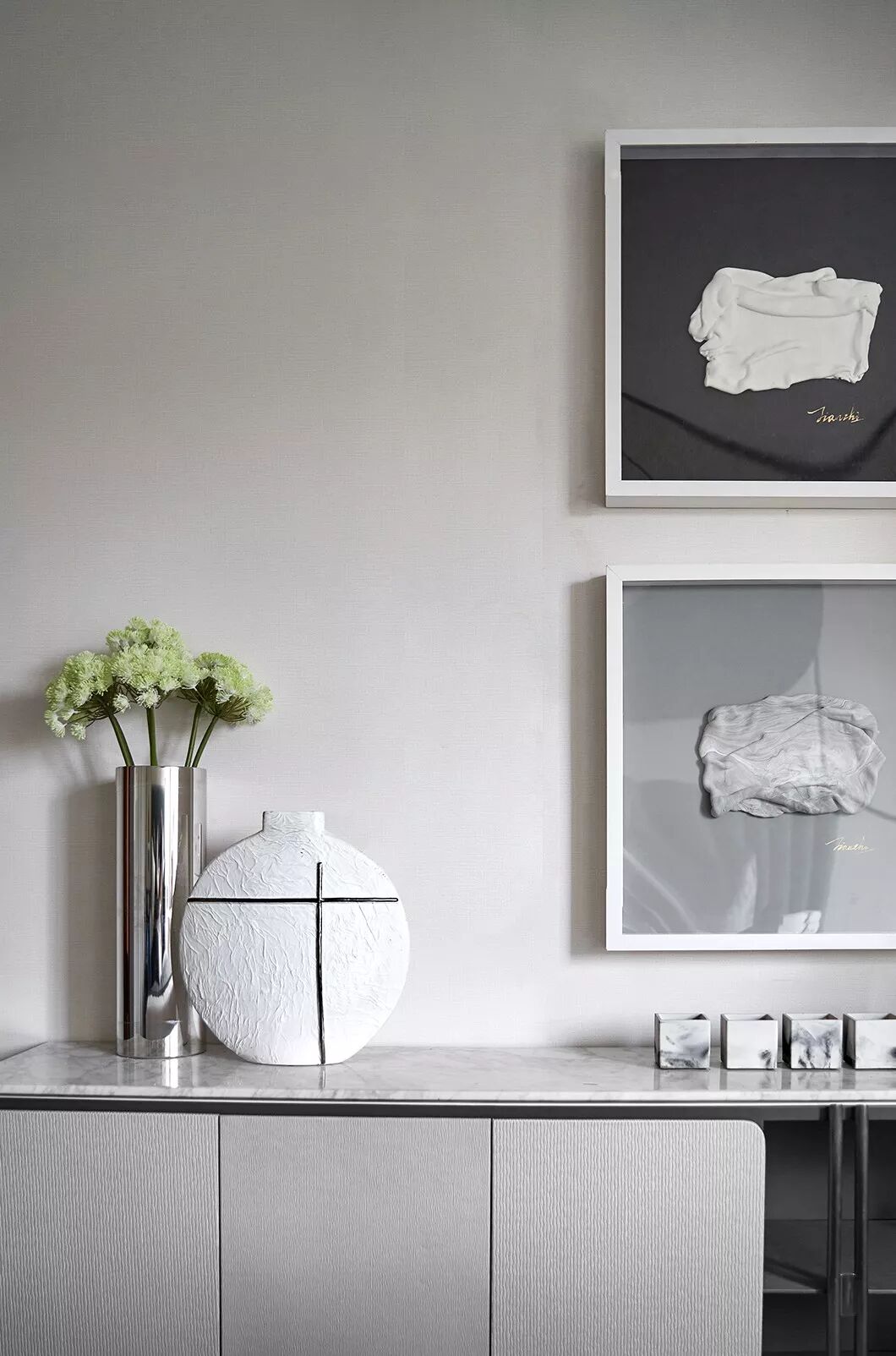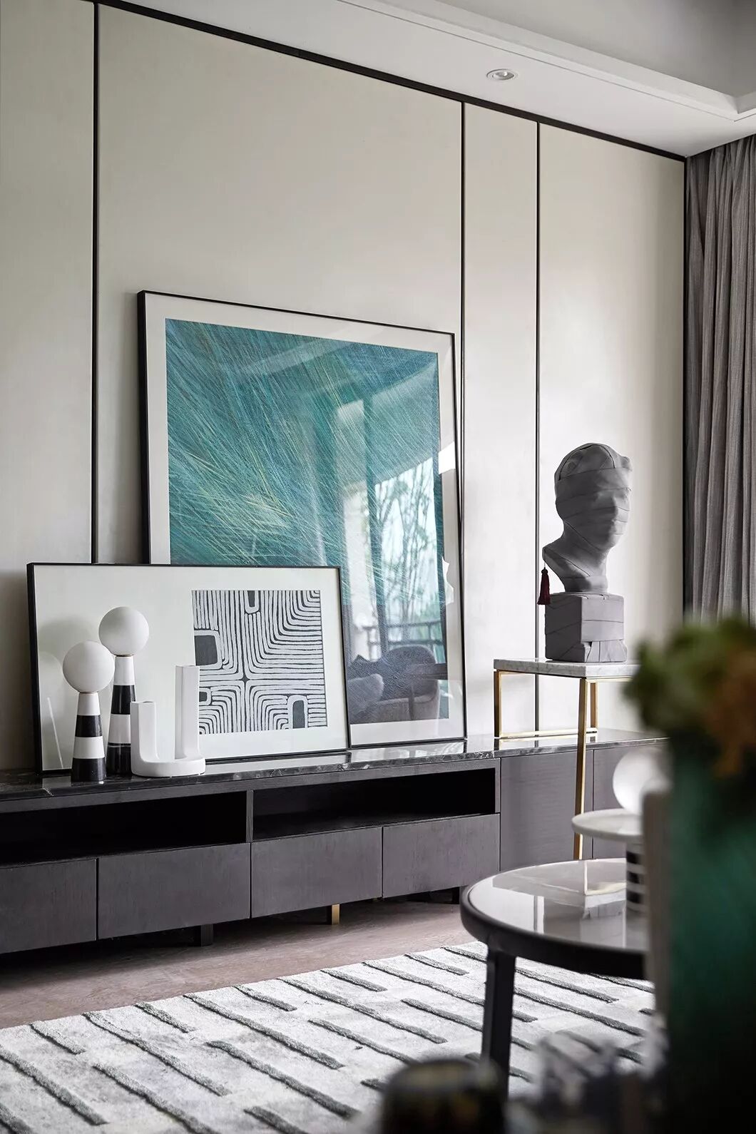 主卧空间中使用简约内敛的高级灰作为主色调使人沉淀心灵,绿色是贯穿空间的点缀色,配以舒适温柔的床品,艺术品的穿插、融合打破了空间的平淡乏味,每一处都彰显着居住者优雅的生活状态与情调。