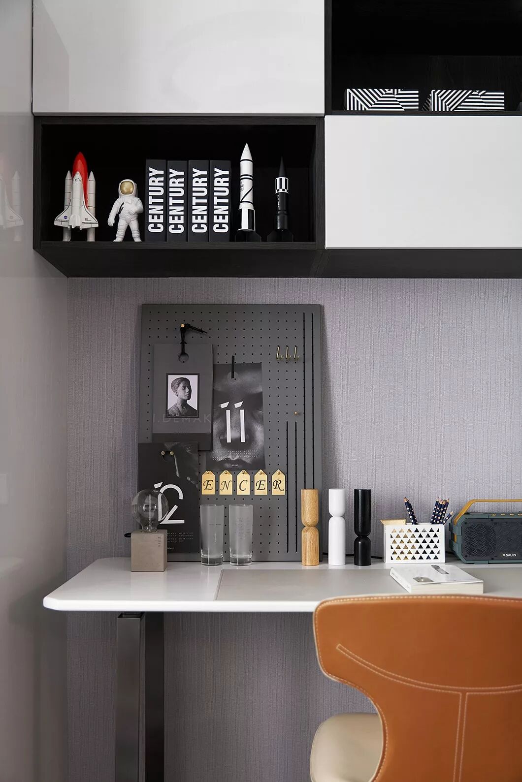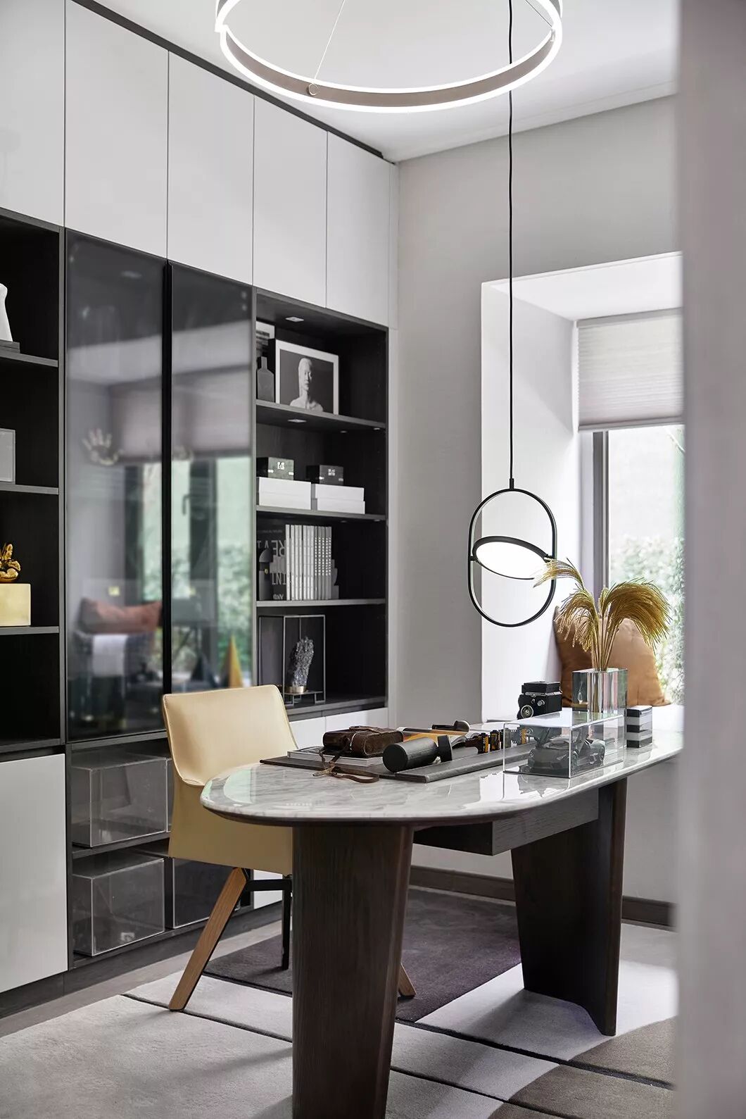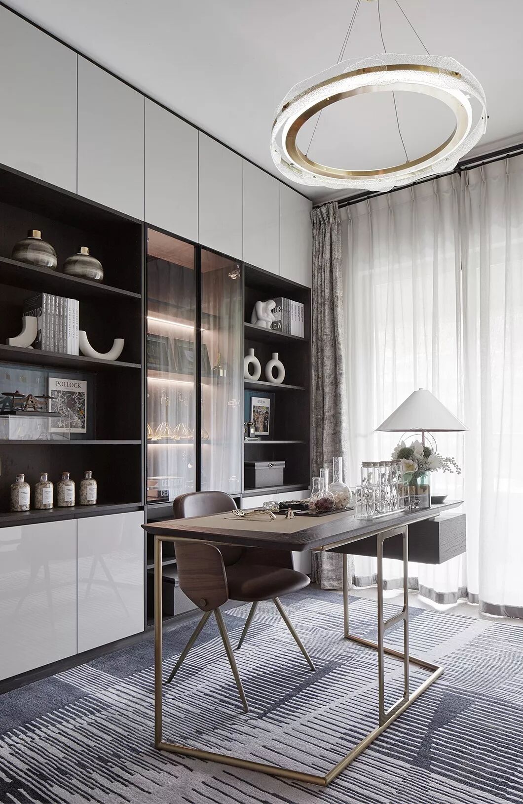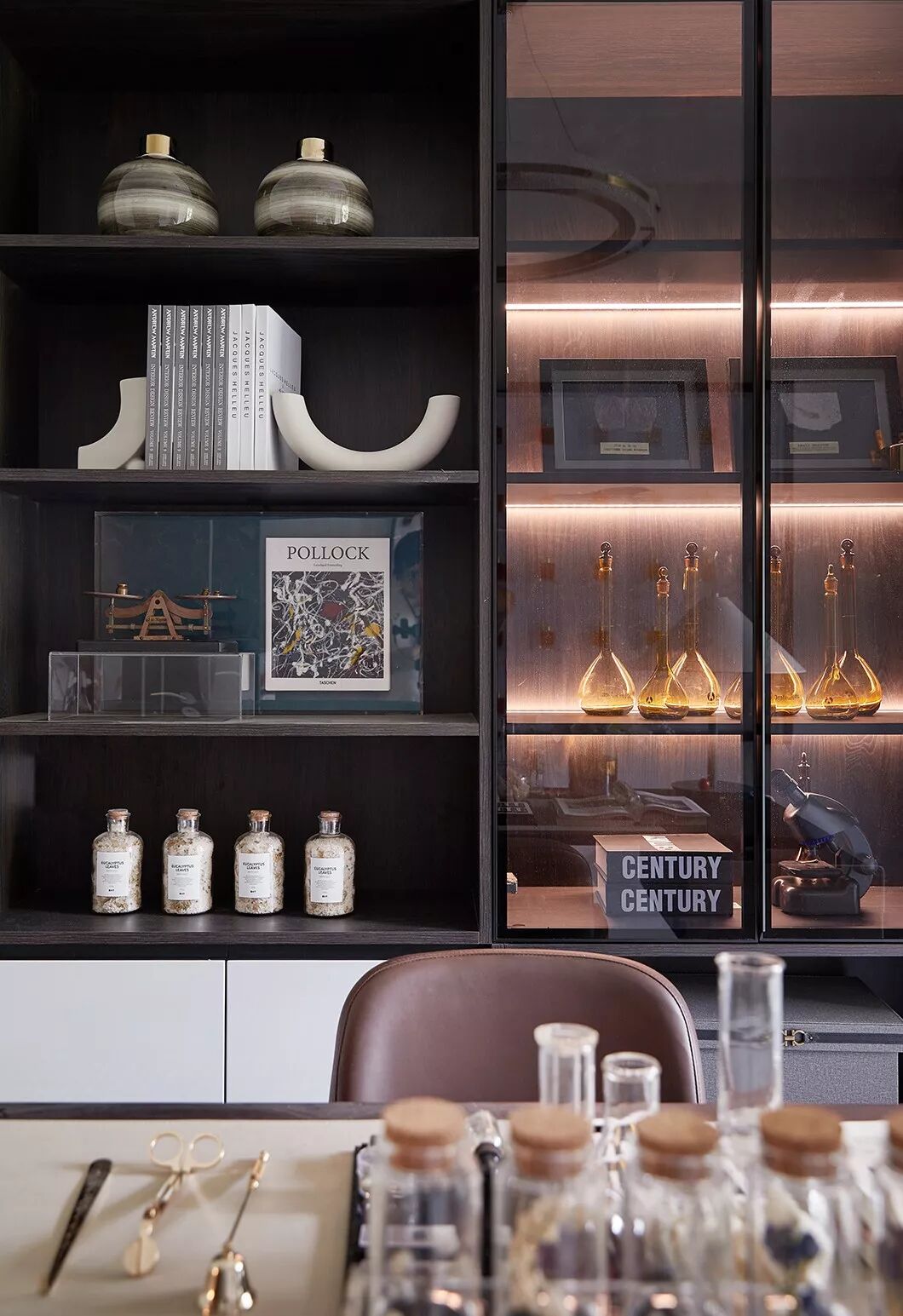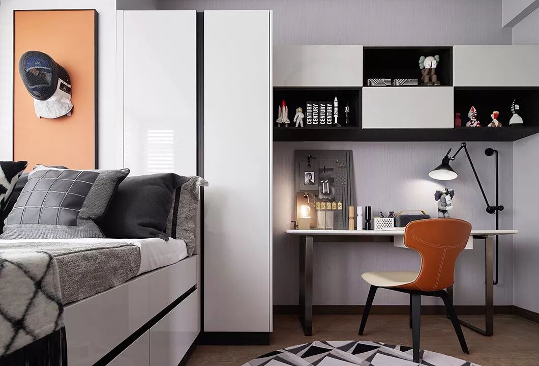 作为居住者独享的个人空间,制香室的打造,以西式调香实验室的创新设计替代了传统样板房中东方禅意的固定风格和布局方式。米白色柜体与胡桃木天然的质感相得映彰,地毯的线条设计丰富了视觉层次感,营造出安谧简约的现代感书房。