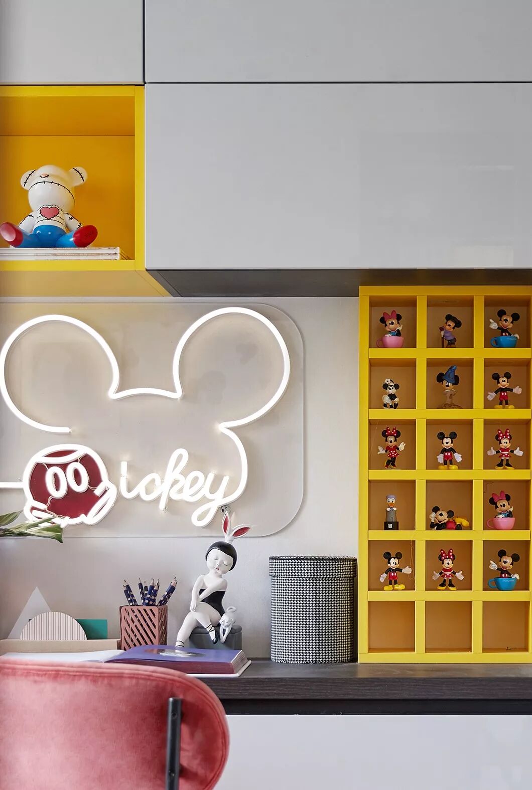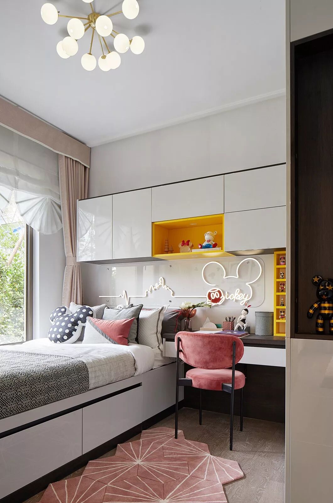 Mickey主题的儿童房搭配粉色与黄色作为空间点缀色,呈现不一样的可爱俏皮气息,象征孩童天真无瑕的生命力。