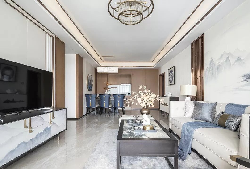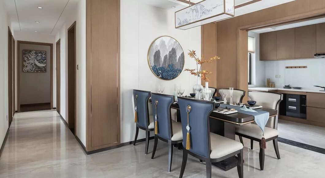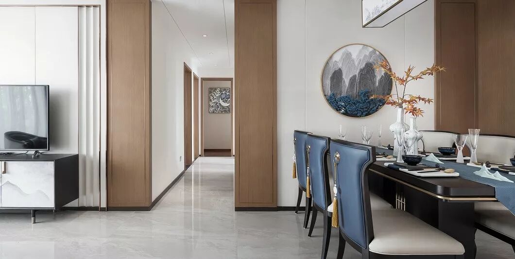 室内主色调汲取了江南水乡高级烟灰蓝,在空间中铺陈出别有风致的现代中式美学,处处透露着对东方清雅生活意境的美好追求。
