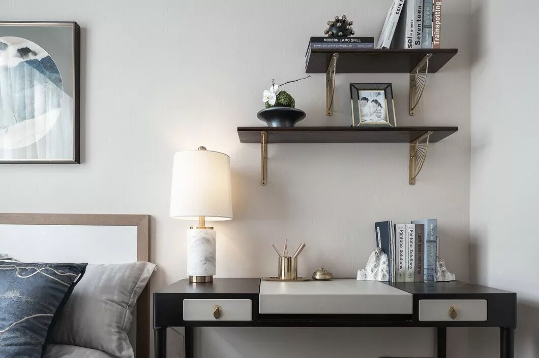 次卧的设计中,色彩的运用清幽淡雅,沉静的灰蓝调和趋近自然的木色是空间的主调,丝质与棉麻床品深具质感,水墨背景造型、瓷器台灯、花卉等各类小品摆设其中,相映成趣,空间气质盈盈。