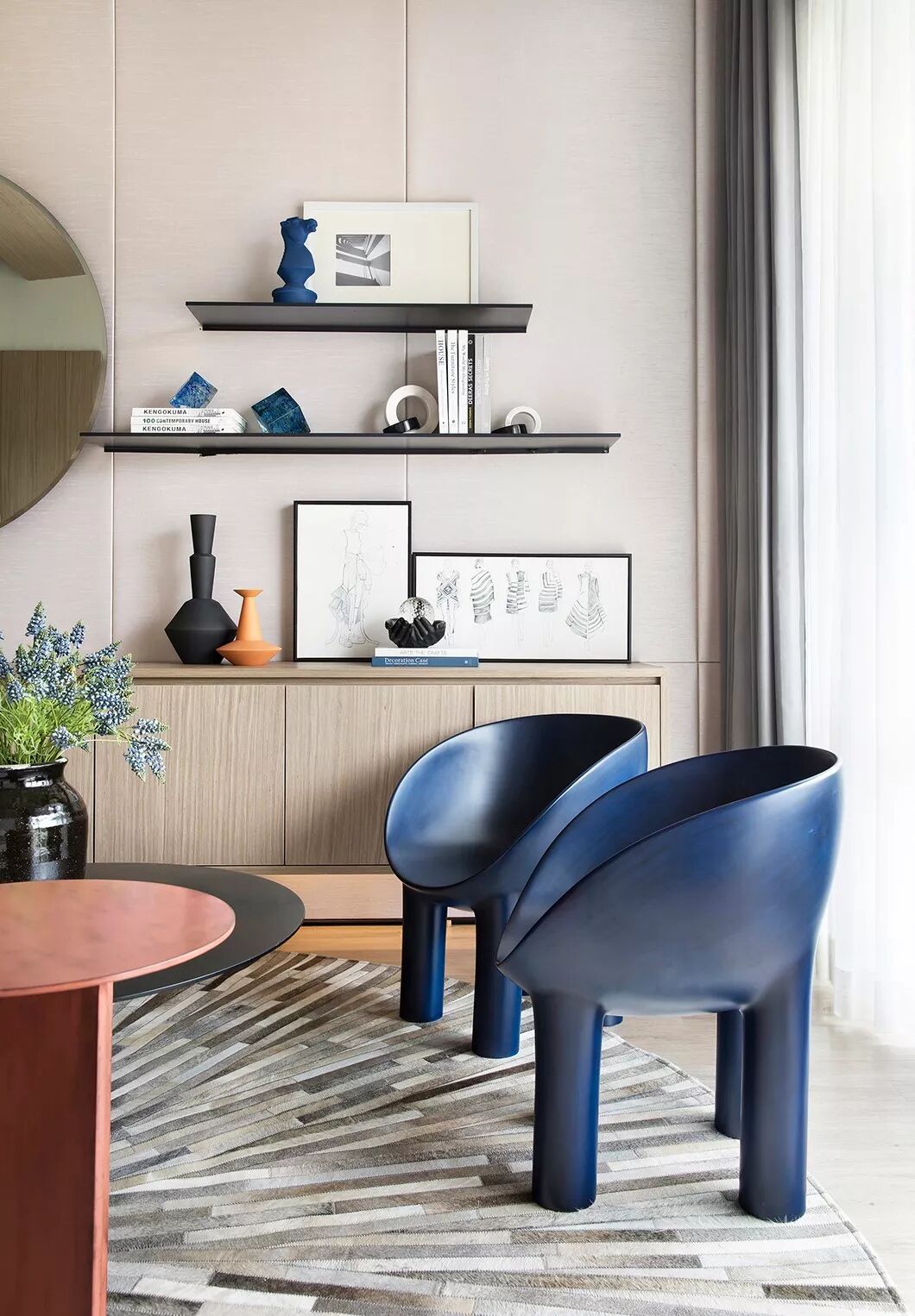 生活的诗意万象浮现于点滴日常,艺术的美感亦通过细节延展出诗意的具象。本案设定为一个艺术家之家,家的外在簇拥着一城繁华,我们的设计在于营造家的艺术与诗意内核,整体定位为书画服装创作工作室风格,呼应居者的身份,匹配对应的生活方式想象,让生活与艺术不期而遇,为居者的艺术生活增添意趣与情致。”设计师怀揣对生活的感知力确定了设计的主题。