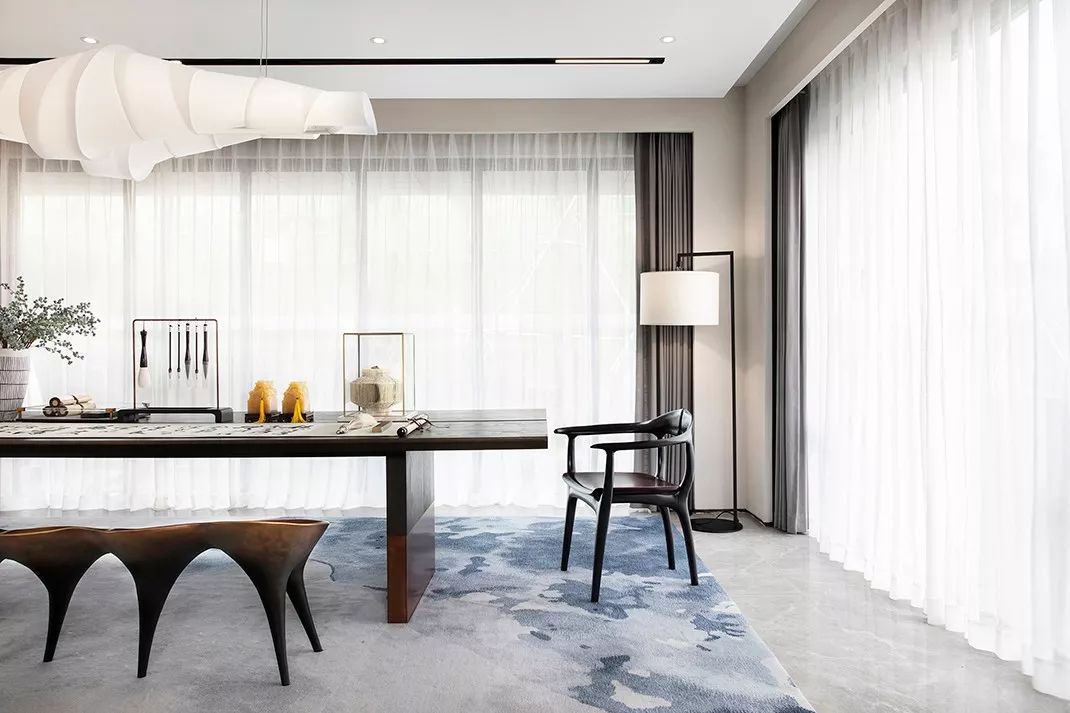 工作室是主人恣意展现才华的地方,设计将艺术家的表现力与浸染力发挥得淋漓尽致,将时尚的潮流感更好地呈现出来,延续了整体的诗意情调,规整的况味与不规则的诗意于碰撞中新生韵致。纯白色的工作台、泼墨写意的地毯、极具现代感的灯饰,搭配简繁有致的面料架与人形立台等工作所需物件,以优雅的造型表达出主人对生活的品质追求,令整个空间充盈着艺术创作的活跃气息。