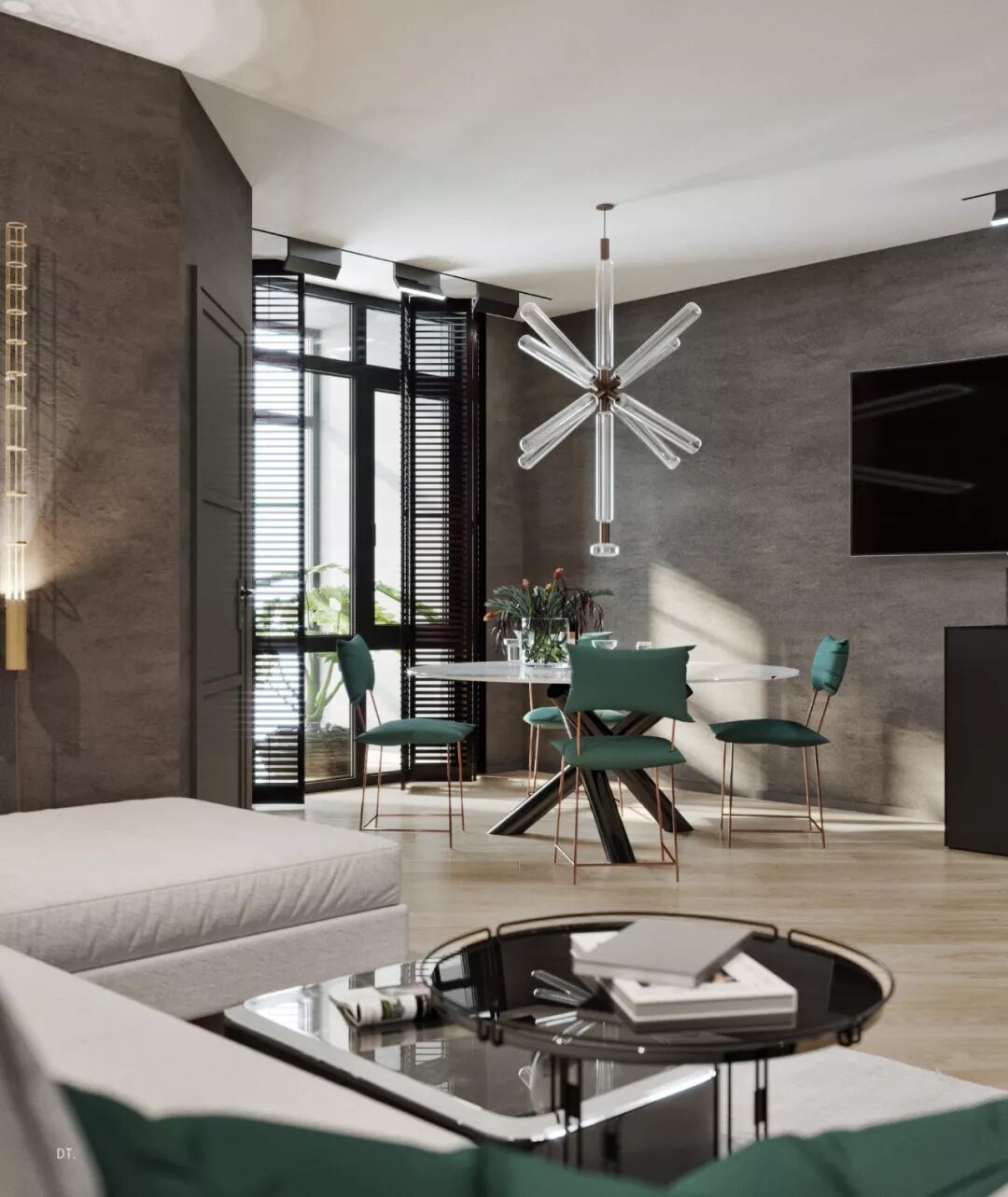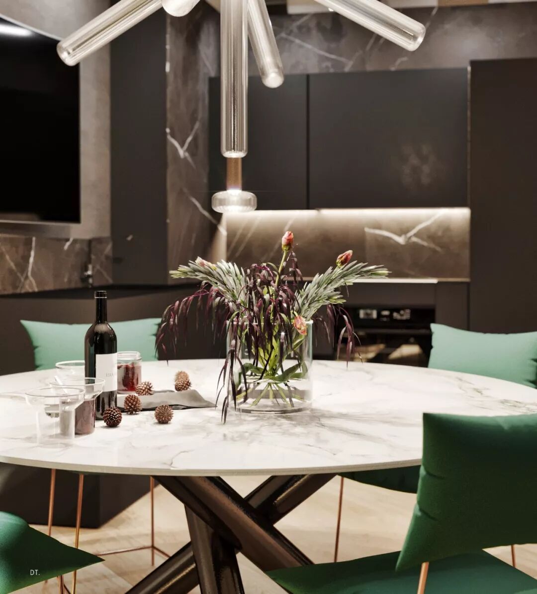 室内的大理石、金属、玻璃、镜面等元素,其材质本身自带的高级感、华丽感,四两拨千斤地把轻奢风的精致感呈现的淋漓尽致。