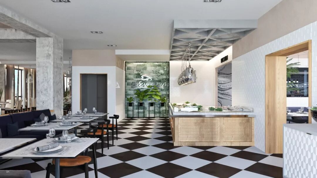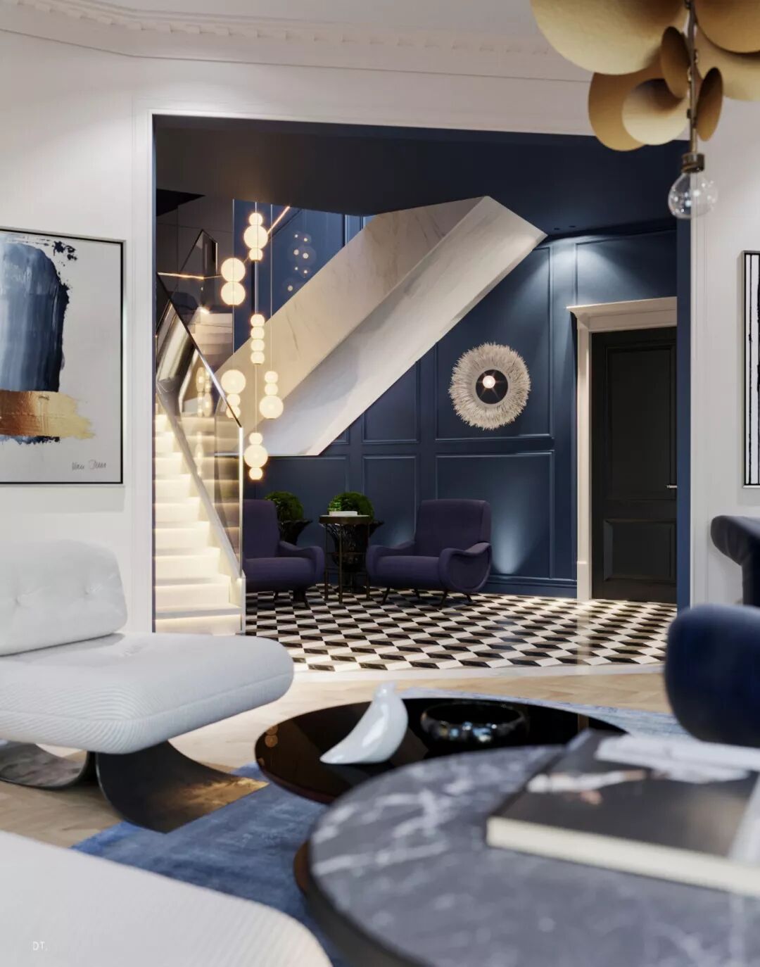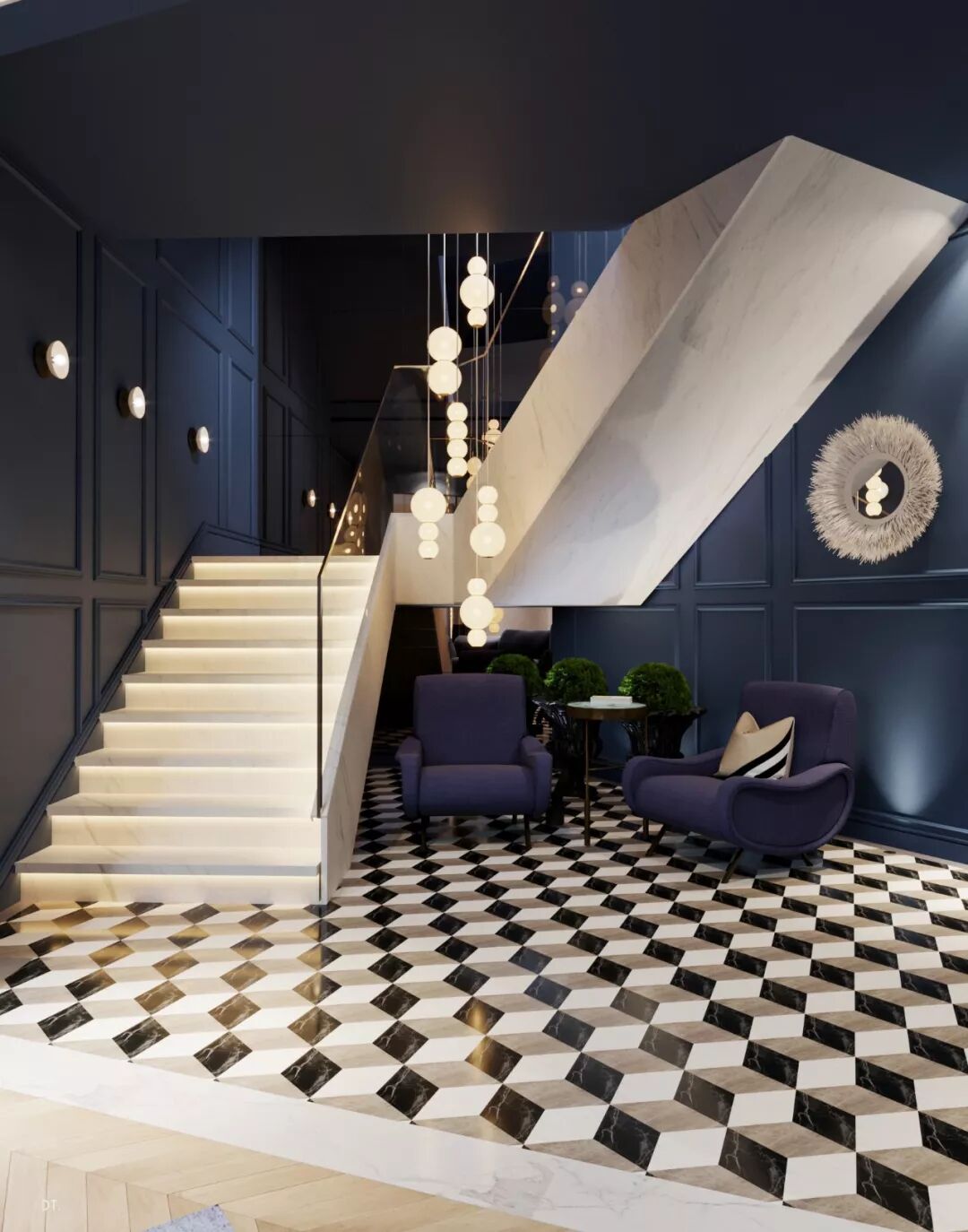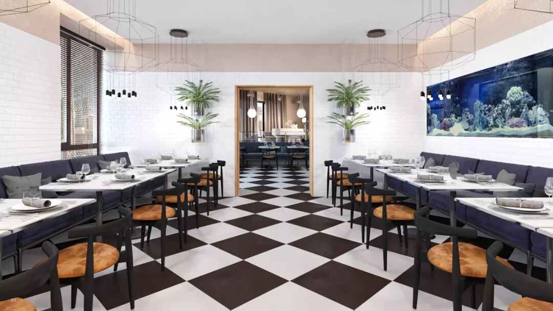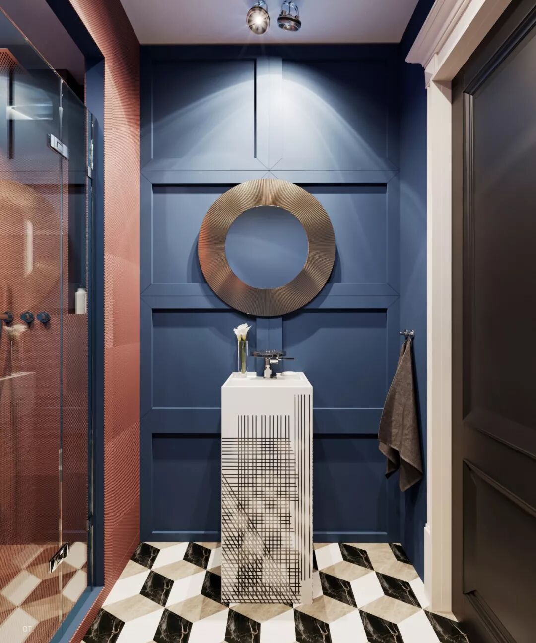 区别于第一个,第二个设计更复古,设计手法也更华丽,地面黑白几何地砖立体感强,使空间纵深感更强,藏蓝色木饰面深邃、雅致。
