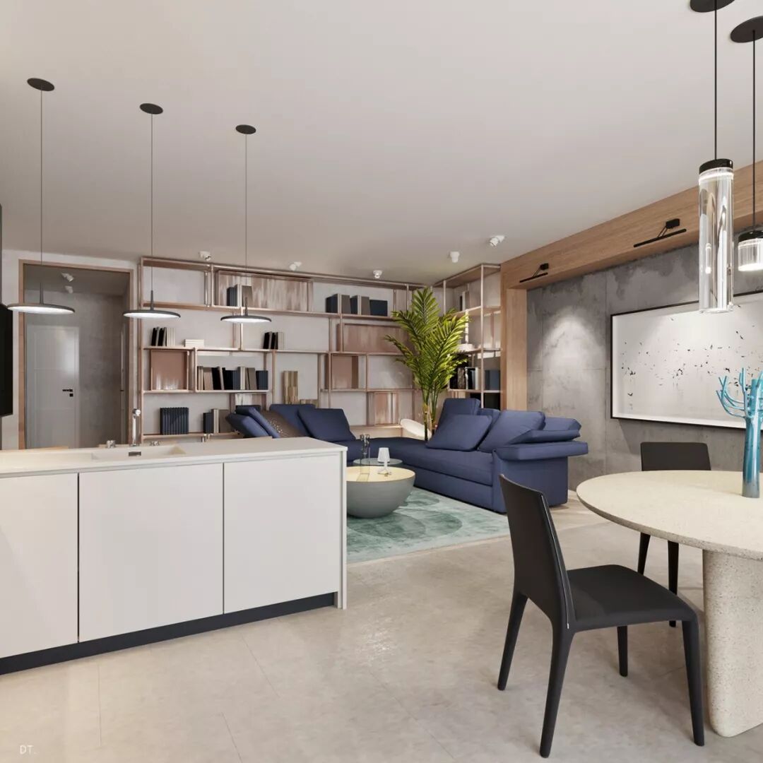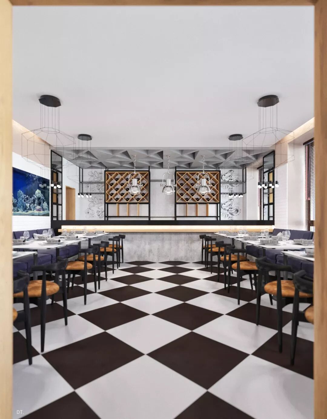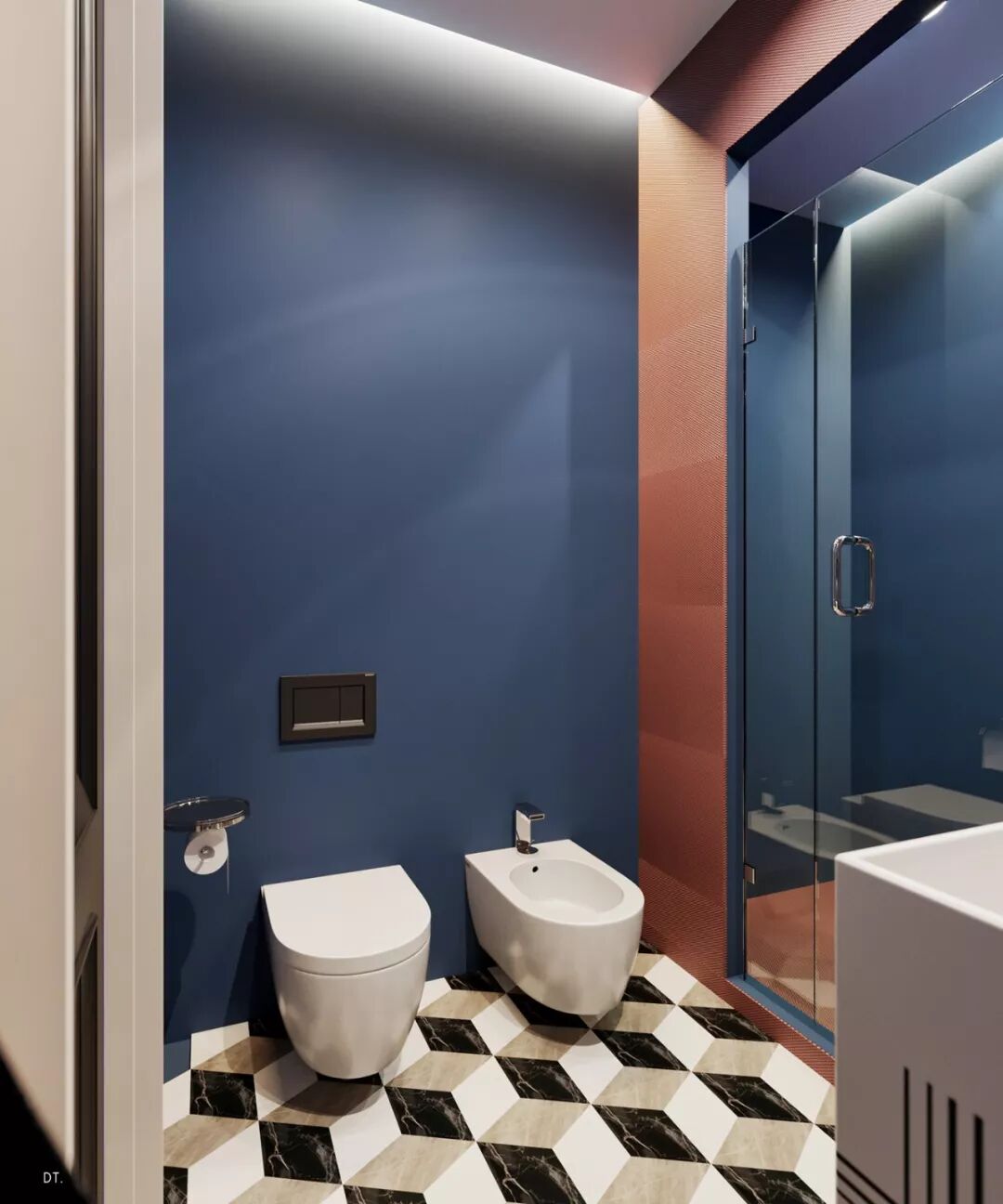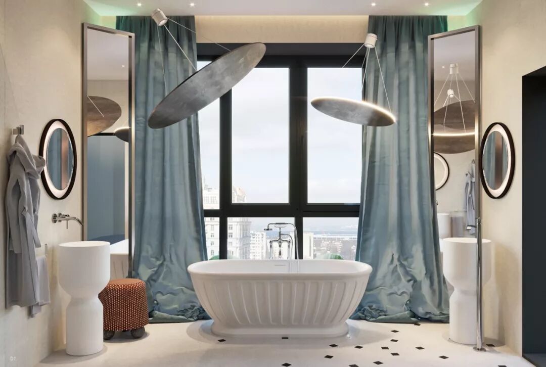 区别于第一个,第二个设计更复古,设计手法也更华丽,地面黑白几何地砖立体感强,使空间纵深感更强,藏蓝色木饰面深邃、雅致。