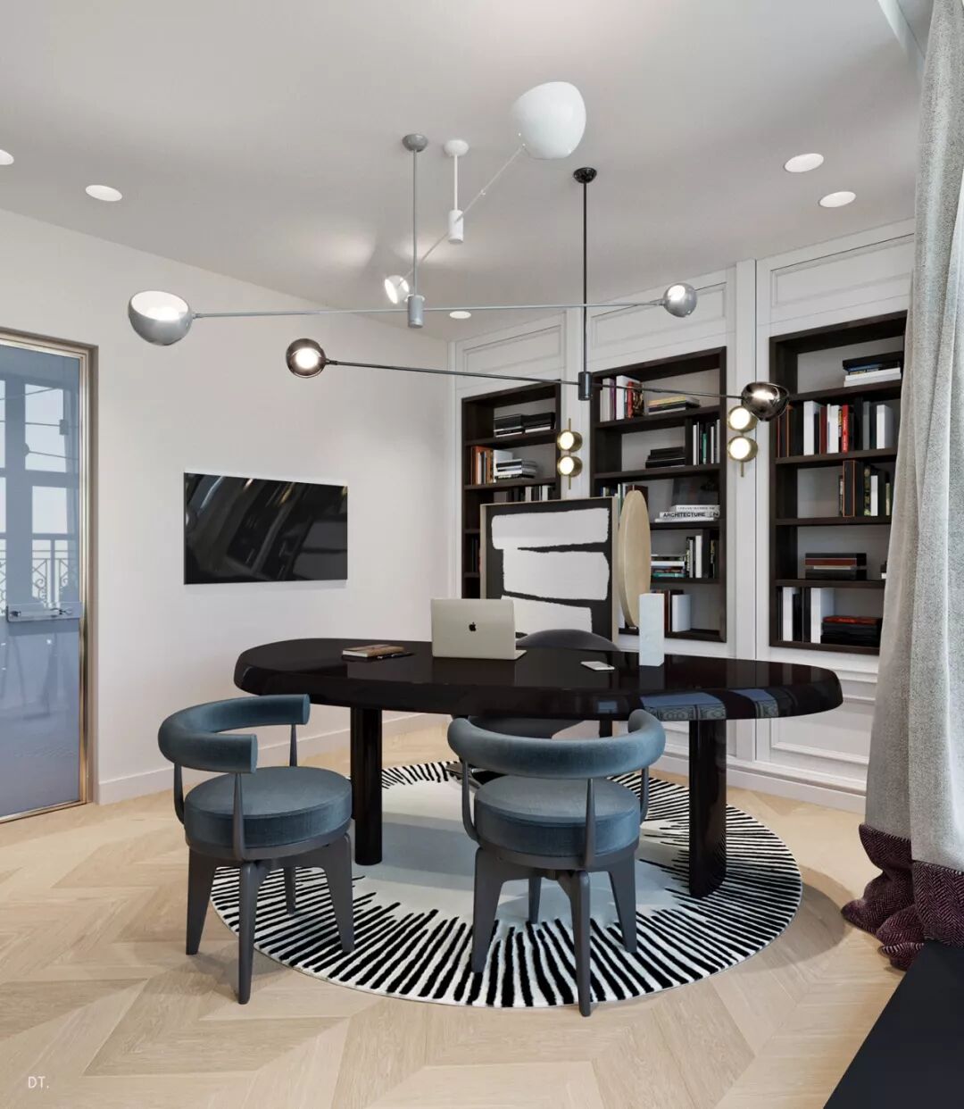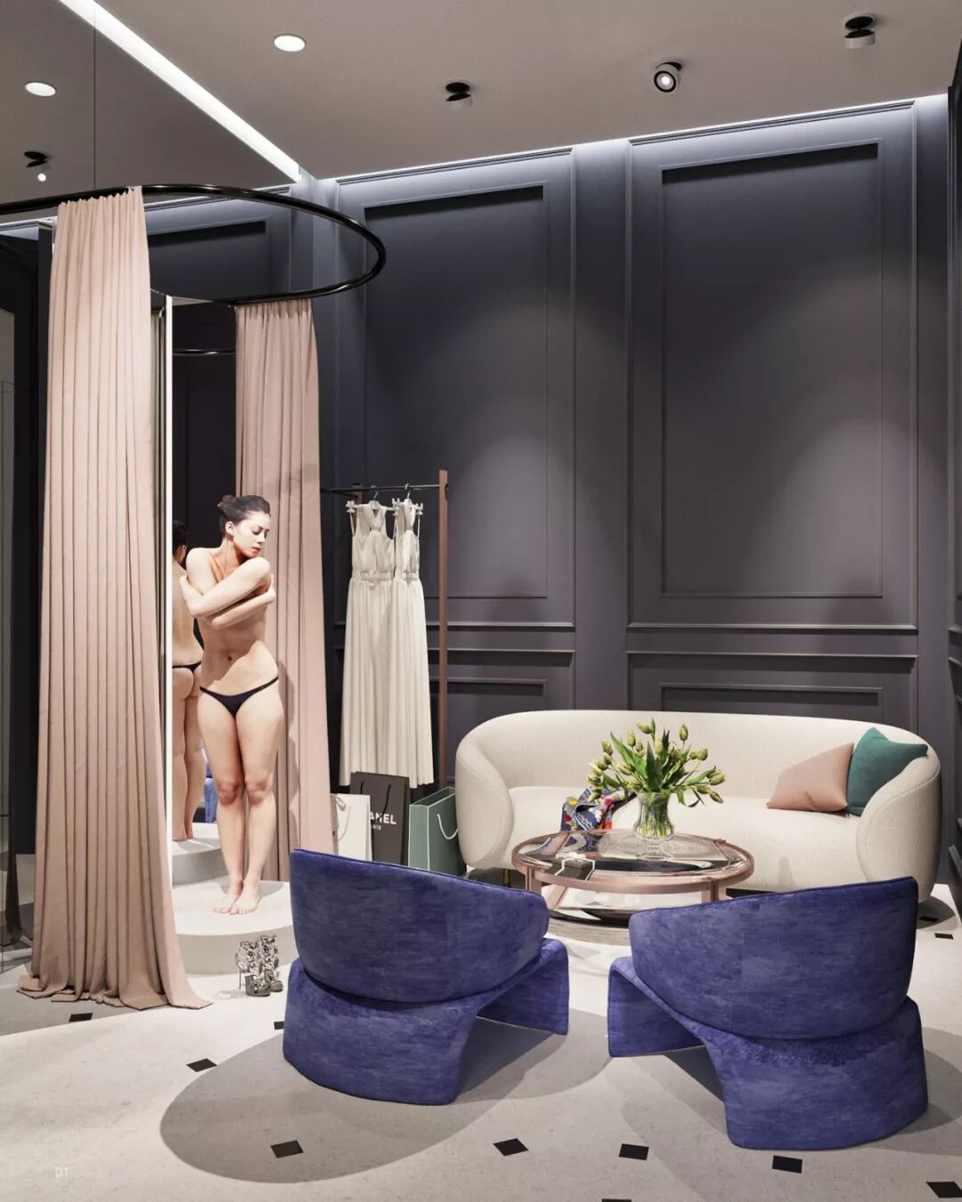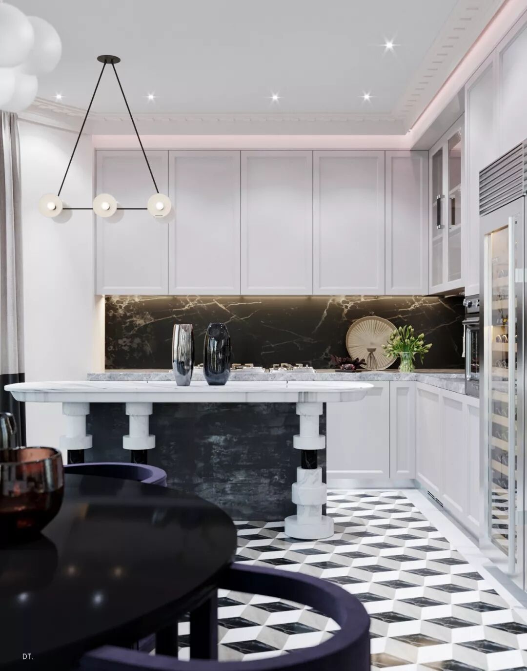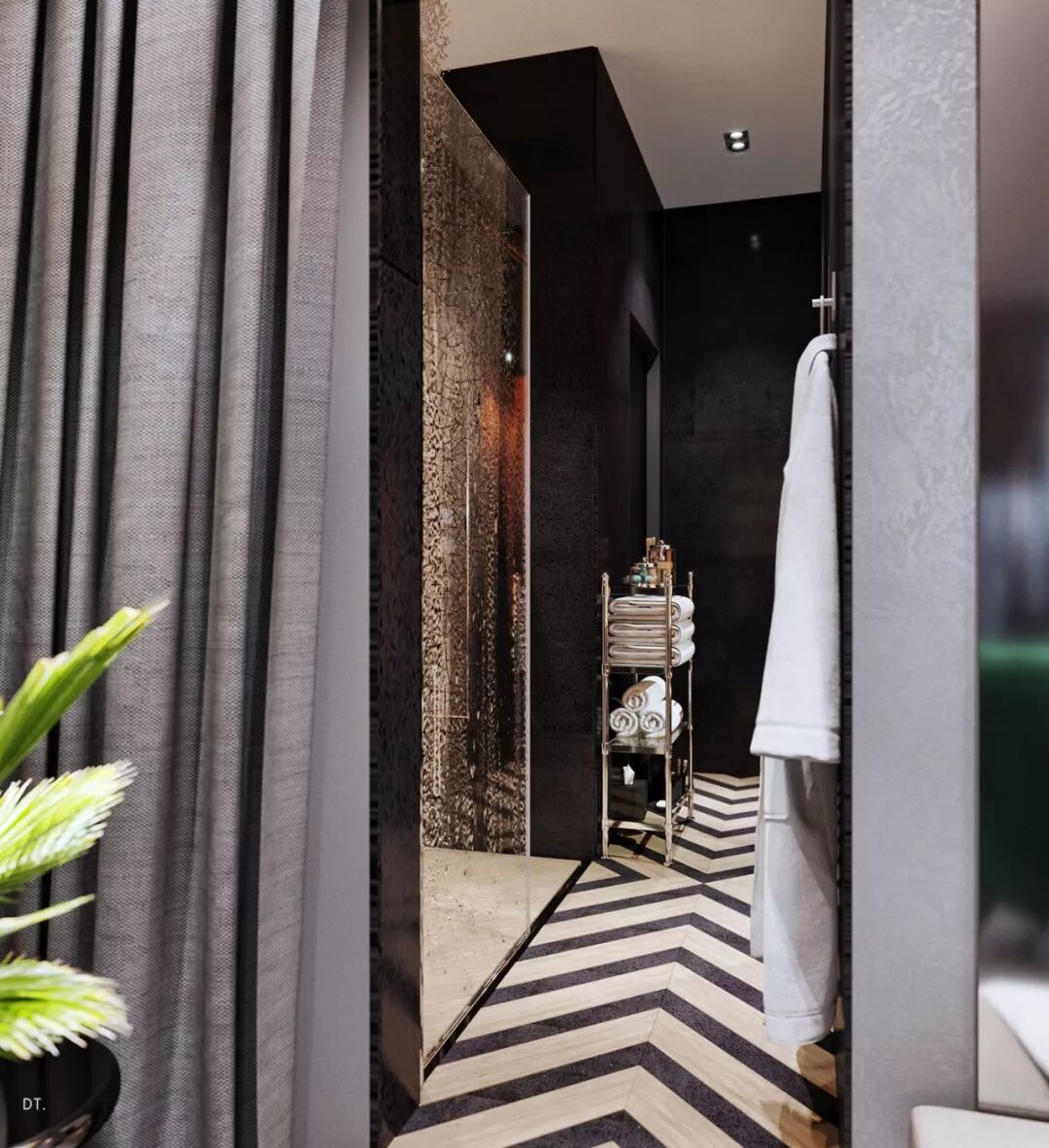 区别于第一个,第二个设计更复古,设计手法也更华丽,地面黑白几何地砖立体感强,使空间纵深感更强,藏蓝色木饰面深邃、雅致。