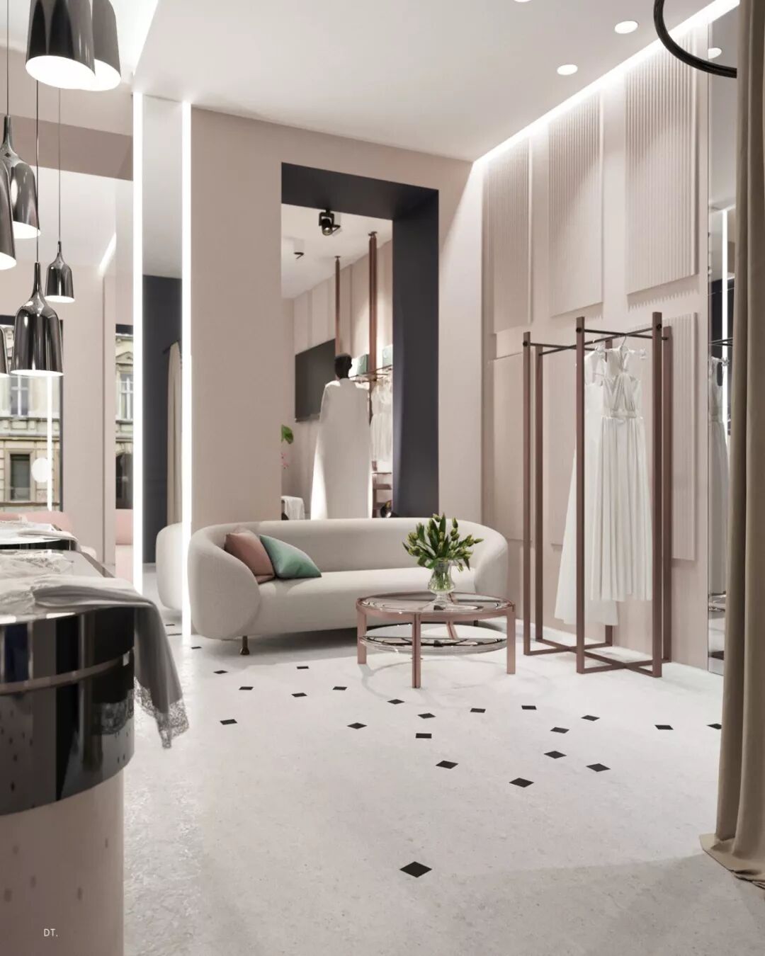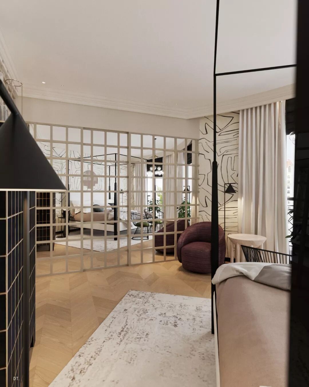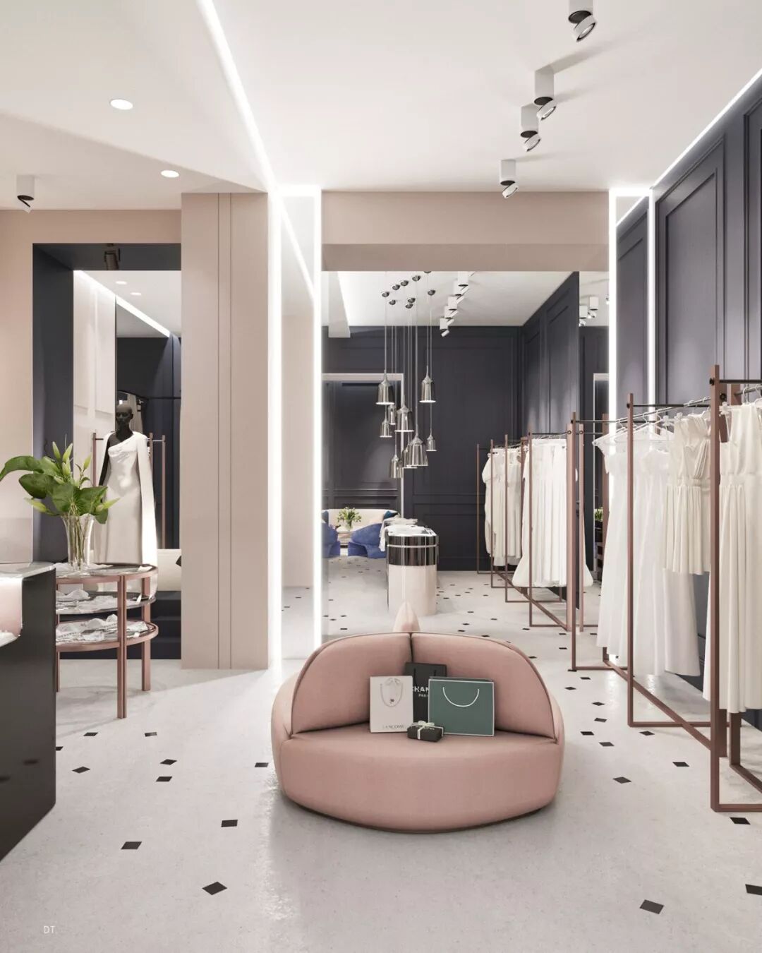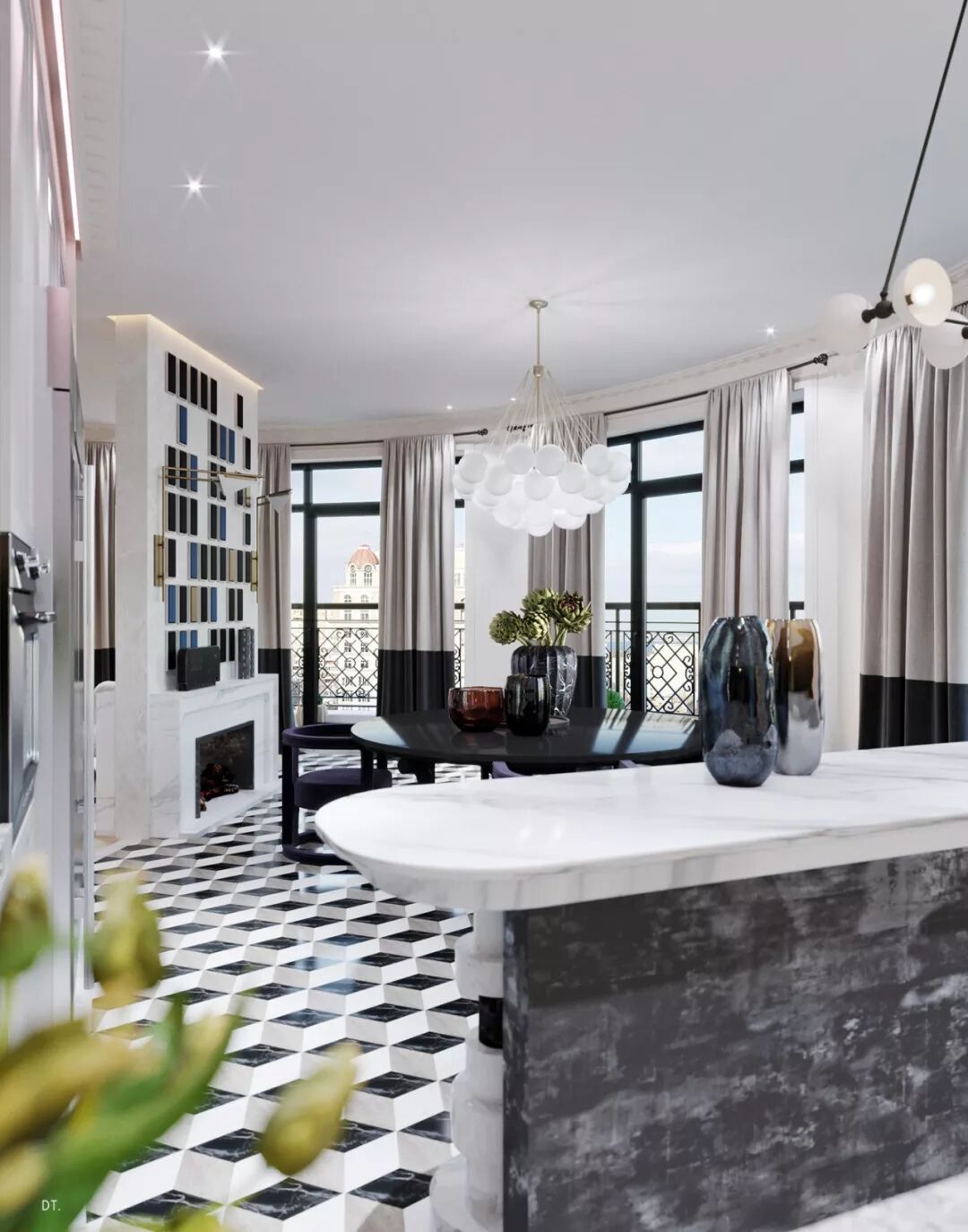 区别于第一个,第二个设计更复古,设计手法也更华丽,地面黑白几何地砖立体感强,使空间纵深感更强,藏蓝色木饰面深邃、雅致。