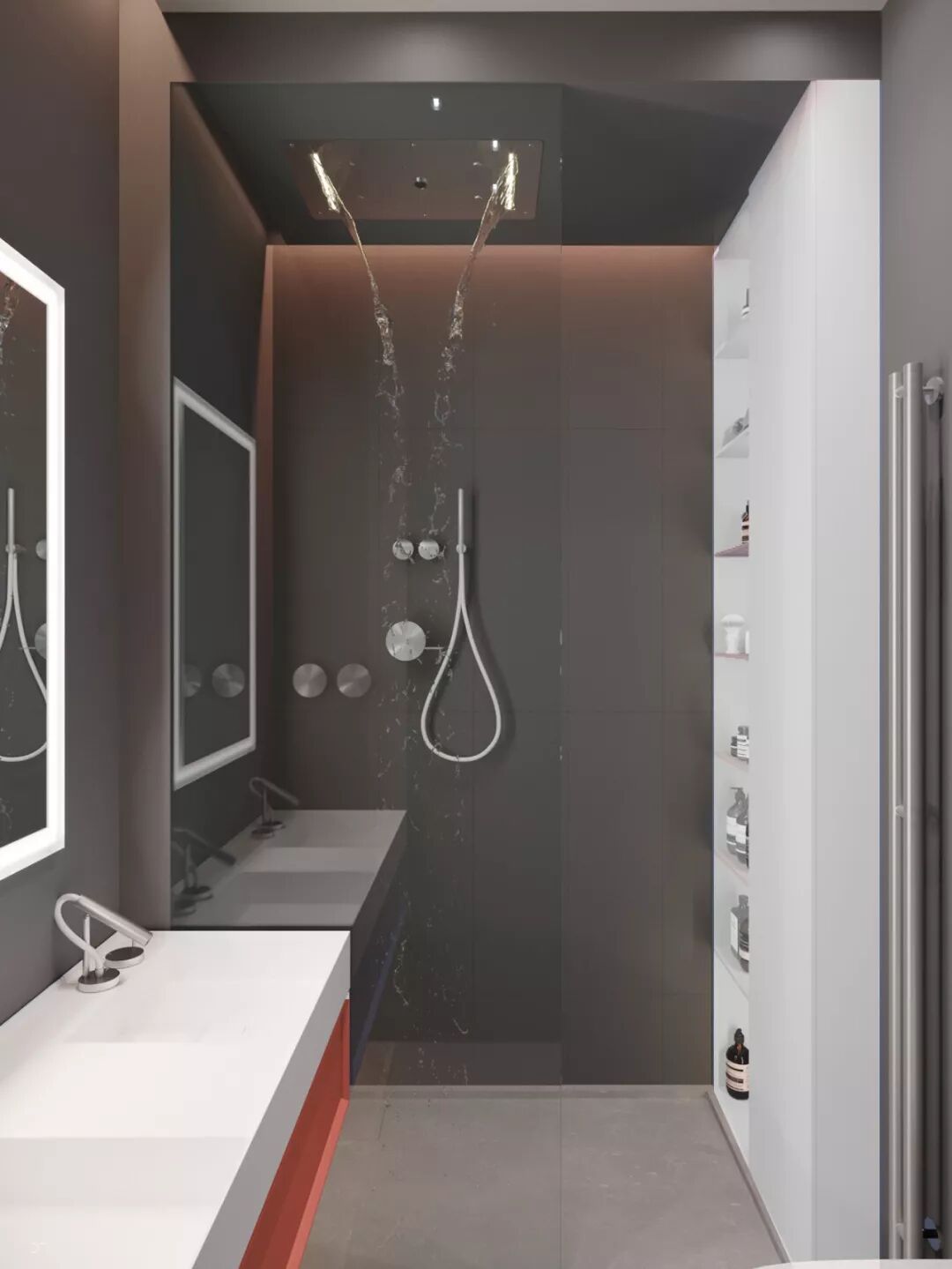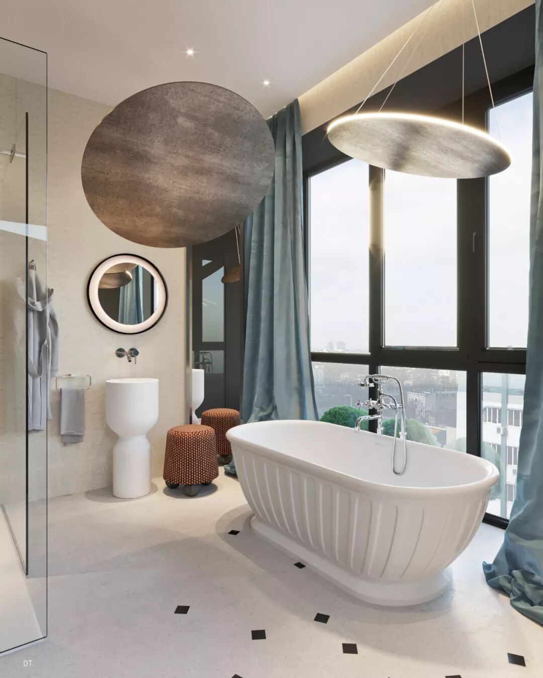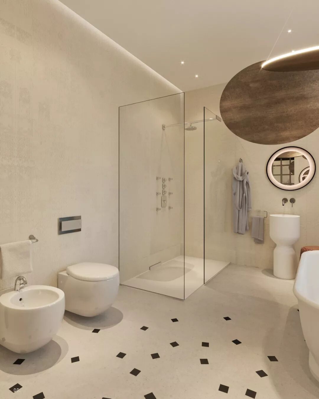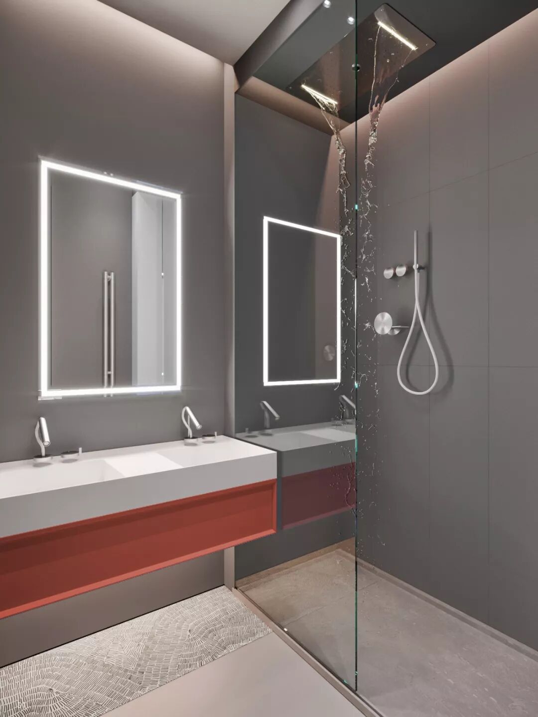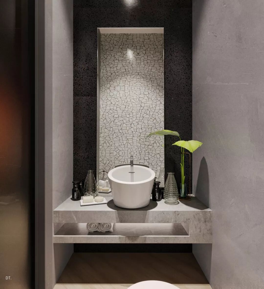 卫浴主墙面的花纹质感满满,以空间灰黑色为主调,与外界的明亮色形成了鲜明对比。