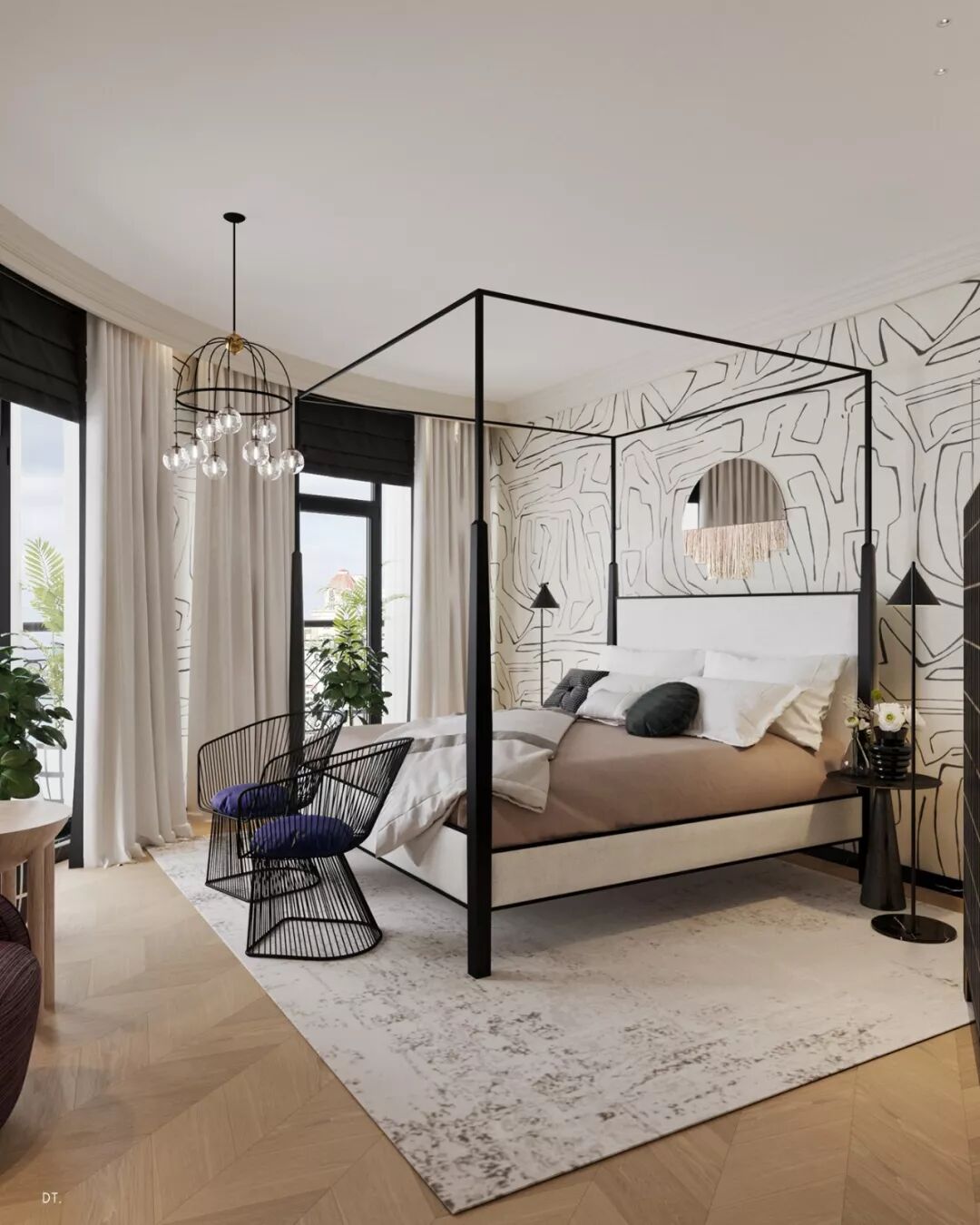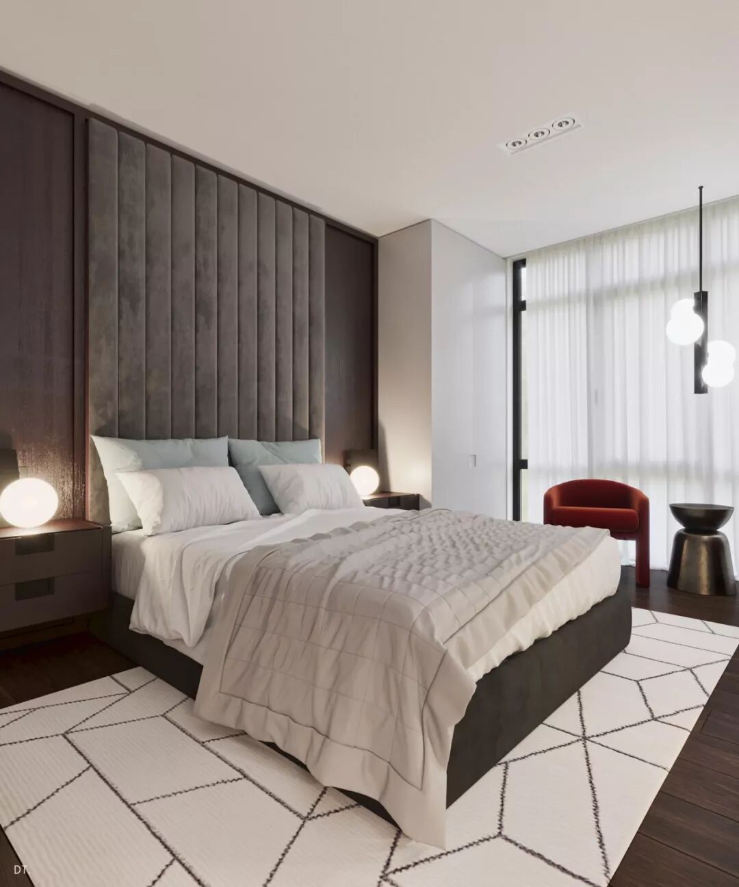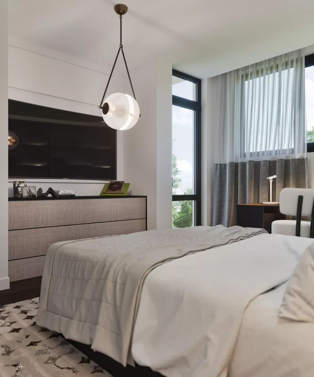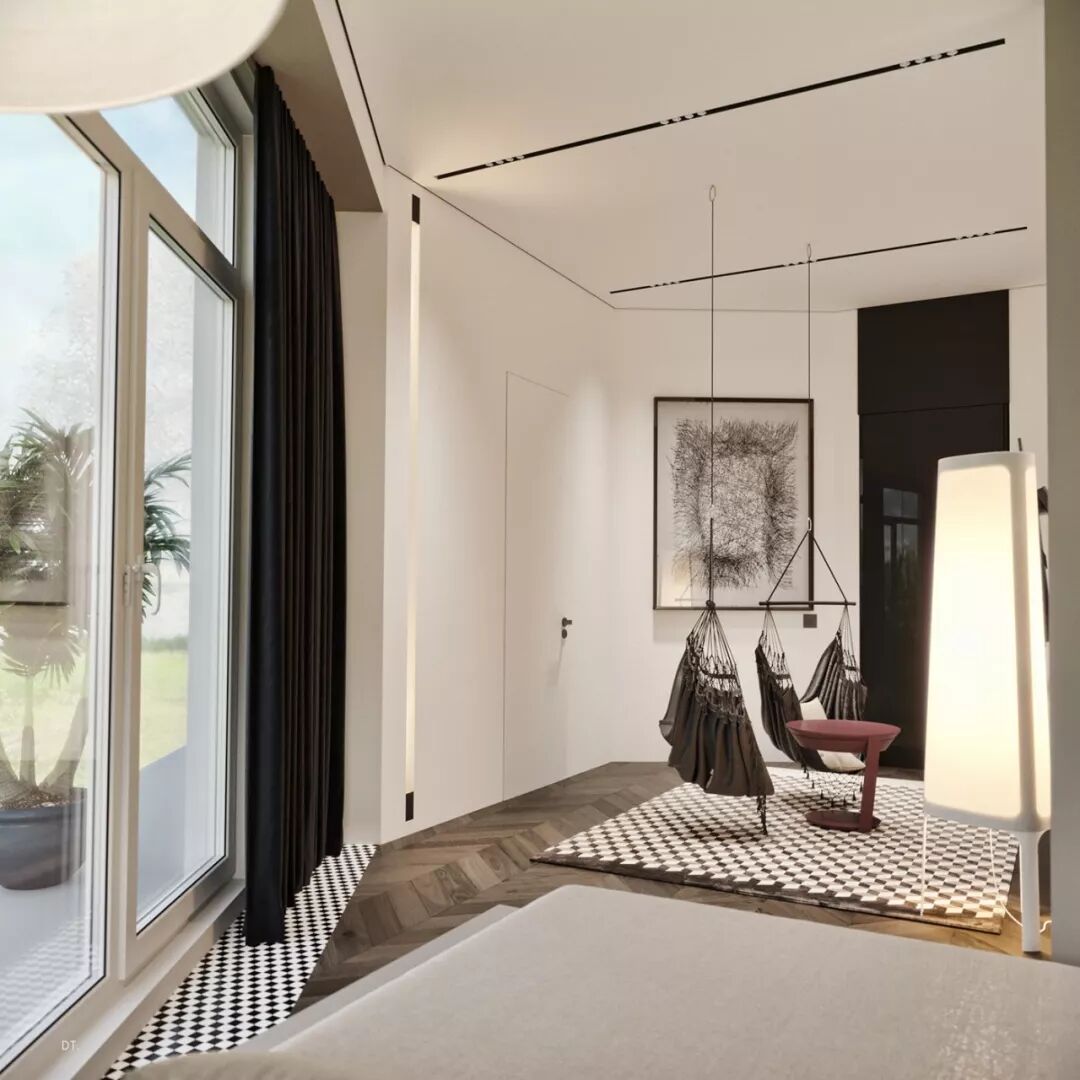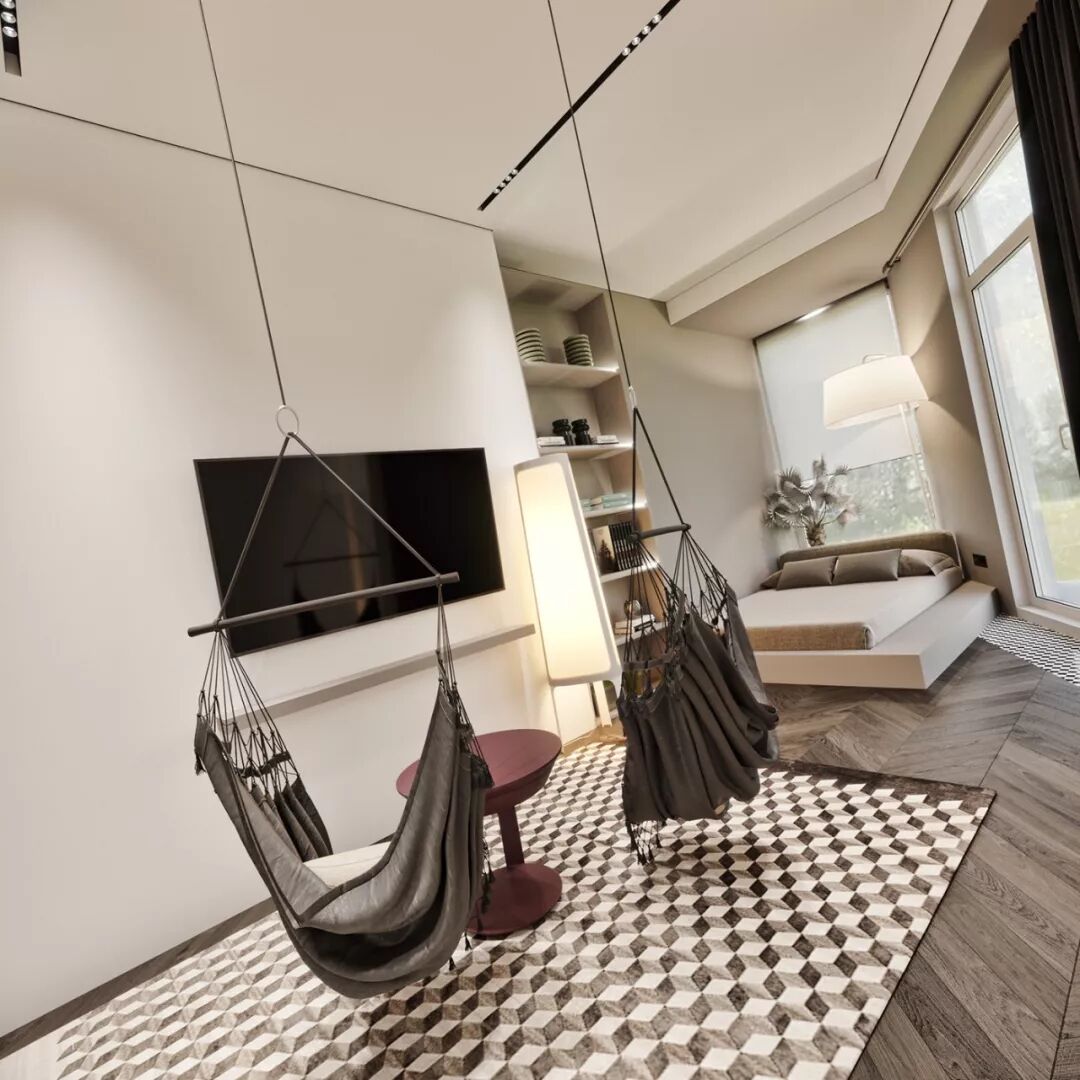 跳出思维方框,别出心裁的两张吊椅置于卧室中央,打造一个有趣而轻松的悠闲之地,给生活制造多一分惊喜。