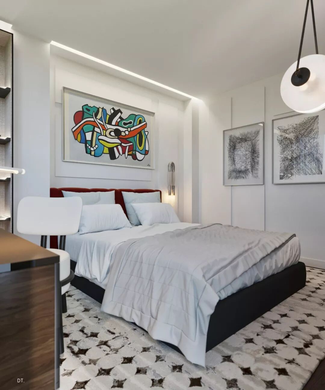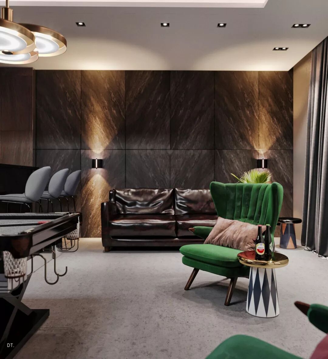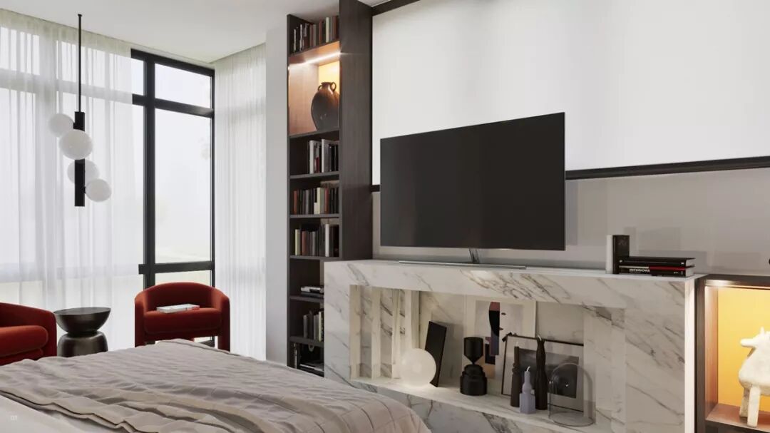 真皮沙发搭配炫黑大理石,直接点燃卧室的轻奢感。空间里无论主体还是细节,都散发着贵气。