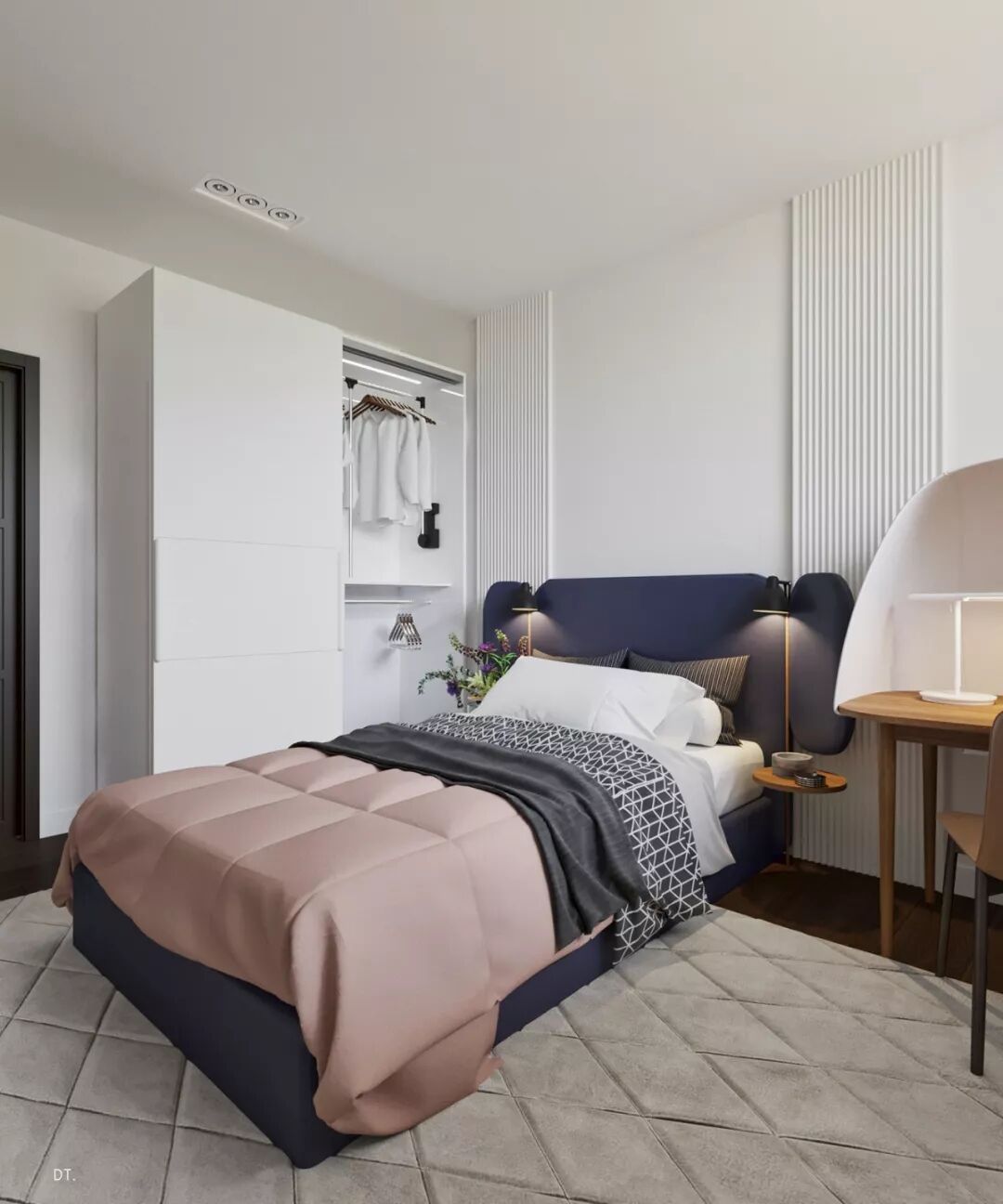 床头的背景墙用柔软绒质作装饰,绒面本身的纹理就比较带质感,这样也能装饰出轻奢感。