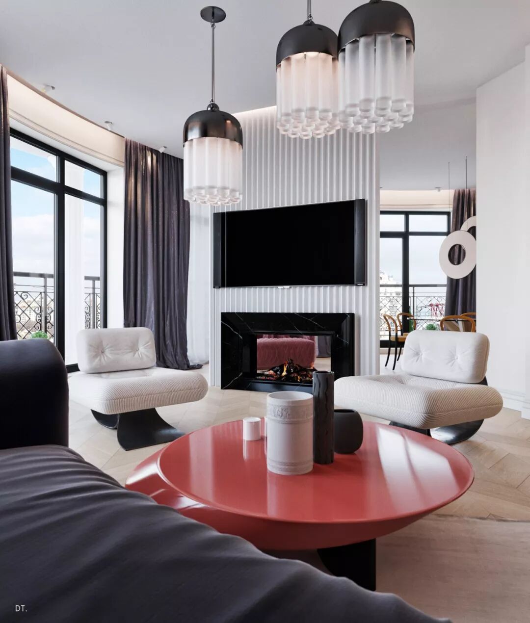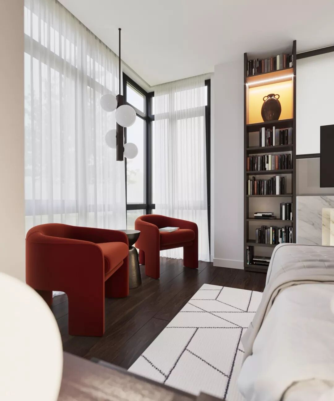 两张红色的沙发椅在素白的空间中迸发出朝气、富有感染力的氛围。