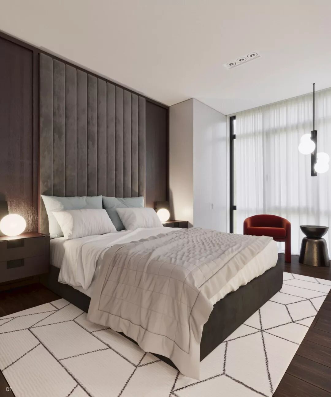 卧室整体上的风格呈现的是现代简约风,线条、结构、图案都讲究简单。