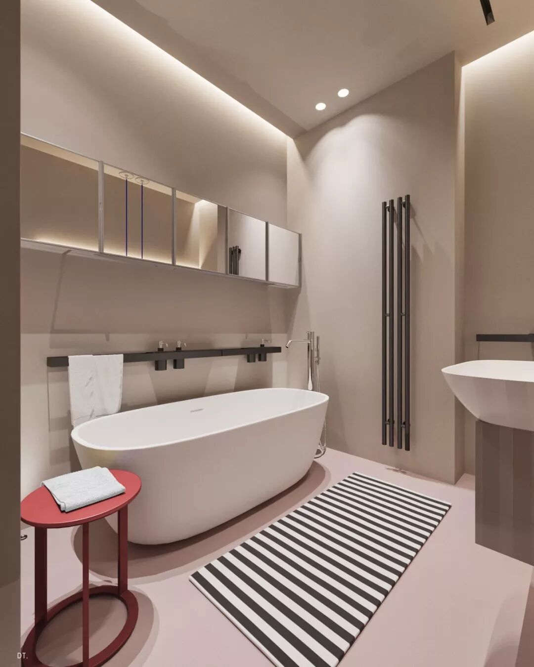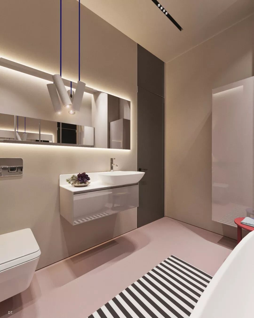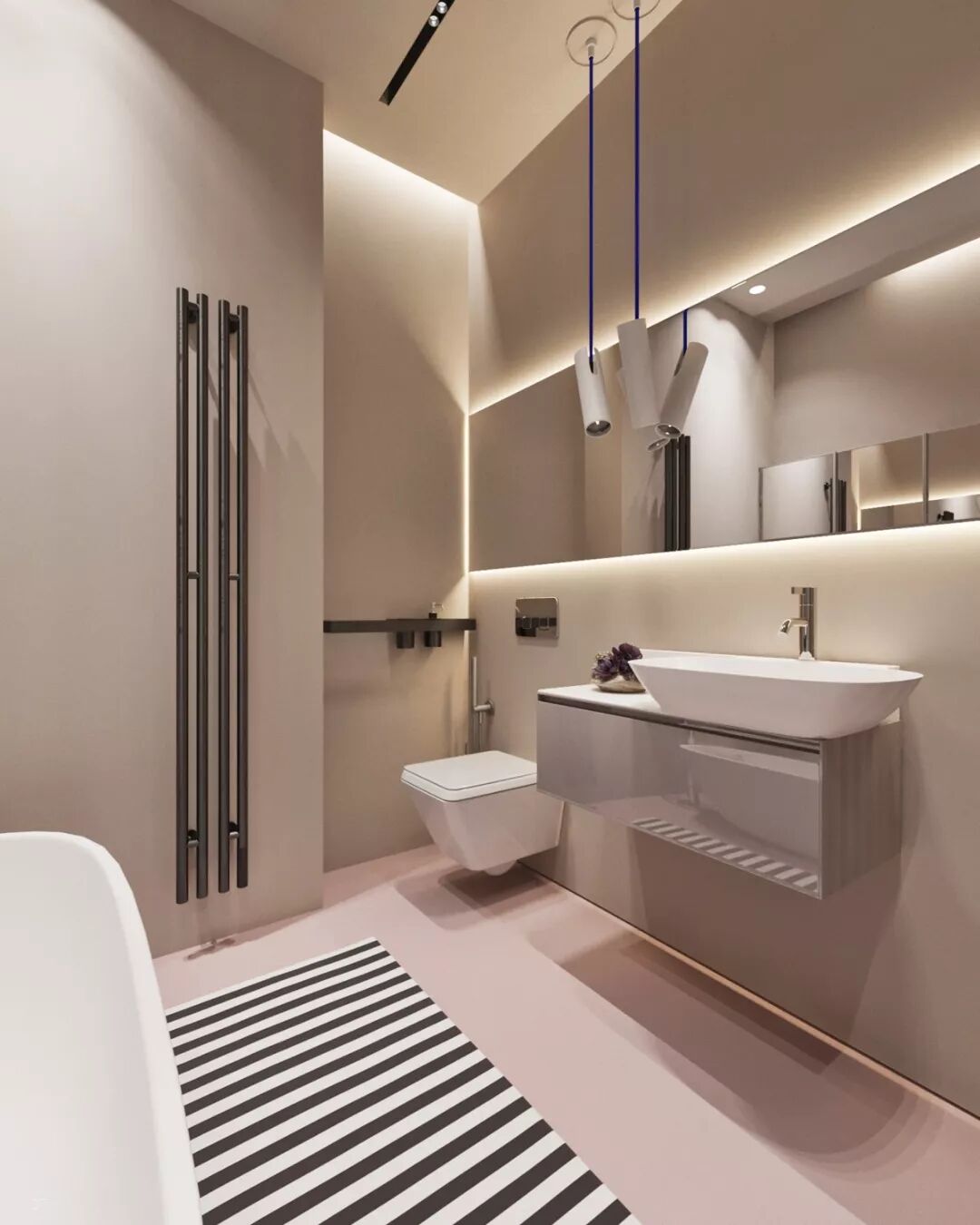 色调材质简单的卫浴,无过多的装饰,仅仅一张条纹地毯成为空间最有力的装饰。