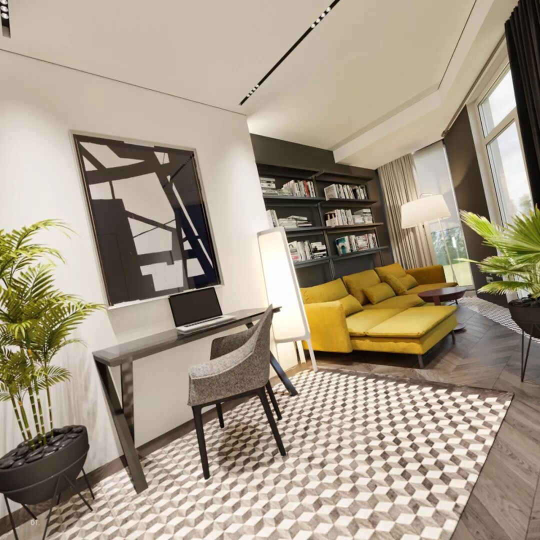 书房黄色沙发、立体图案地毯、大幅的黑白艺术画三者之间使空间充满张力。