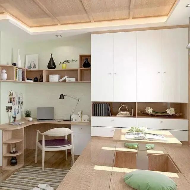 衣柜榻榻米一体化,设计满足了日常的收纳问题。拐角处的书桌沿墙面设计成了L型,节省了空间。榻榻米设计的是升降式桌子,休息、娱乐,实现了一房多用。平时朋友来家里了,可以和朋友在这里喝喝茶、聊聊天也能度过惬意的一天。