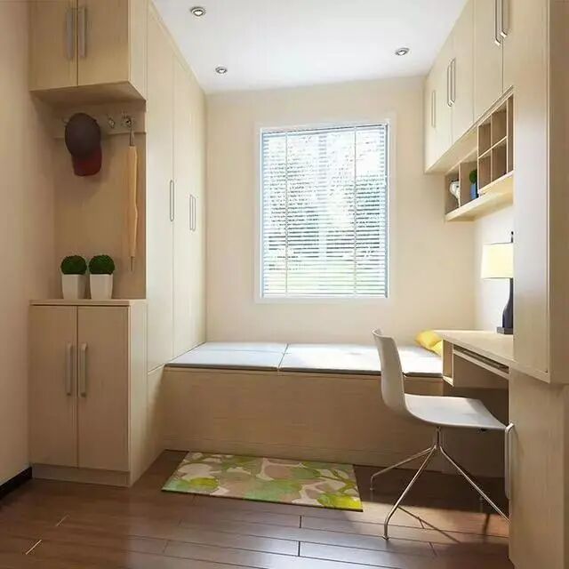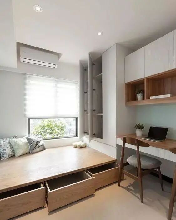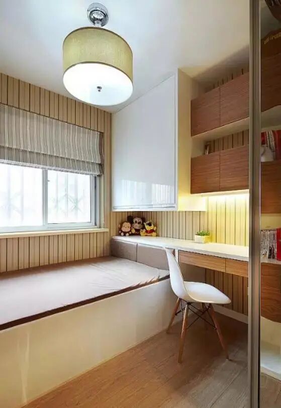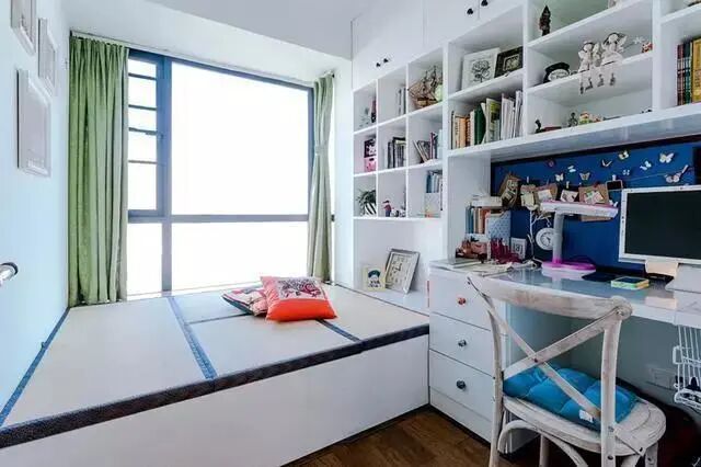 利用飘窗的位置,让室内有着极好的采光。榻榻米底部能够储物,扩大了收纳空间。旁边的书桌书柜一体化,很是实用。书籍放在书柜里保持了桌面的整洁,同时书的拿放也很方便。整个空间被充分利用,而且不显得拥挤。