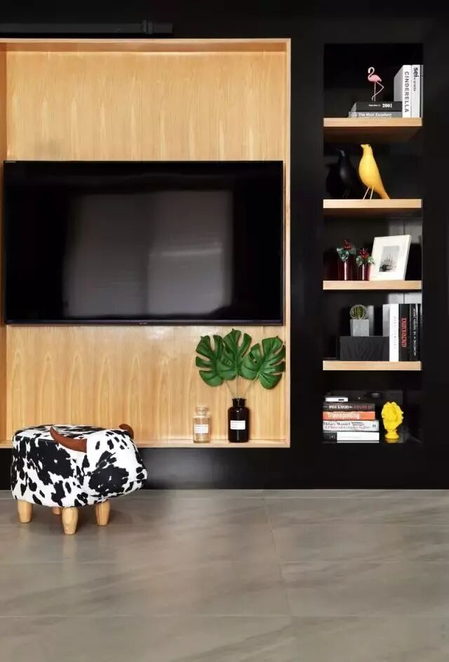 客厅另一面电视墙区域,省略了电视柜的设计,用壁龛来取代,特别是那扇隐形门的设计,就是与电视墙合二为一,很别出心裁。