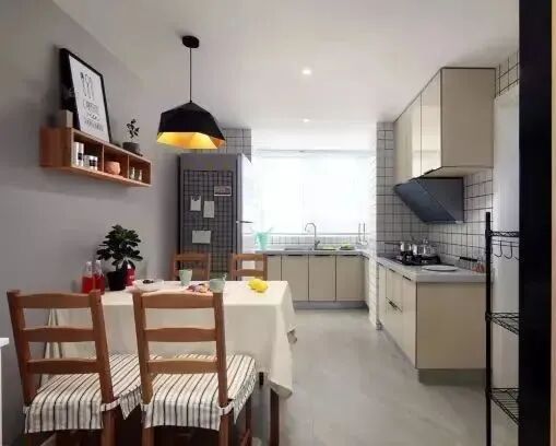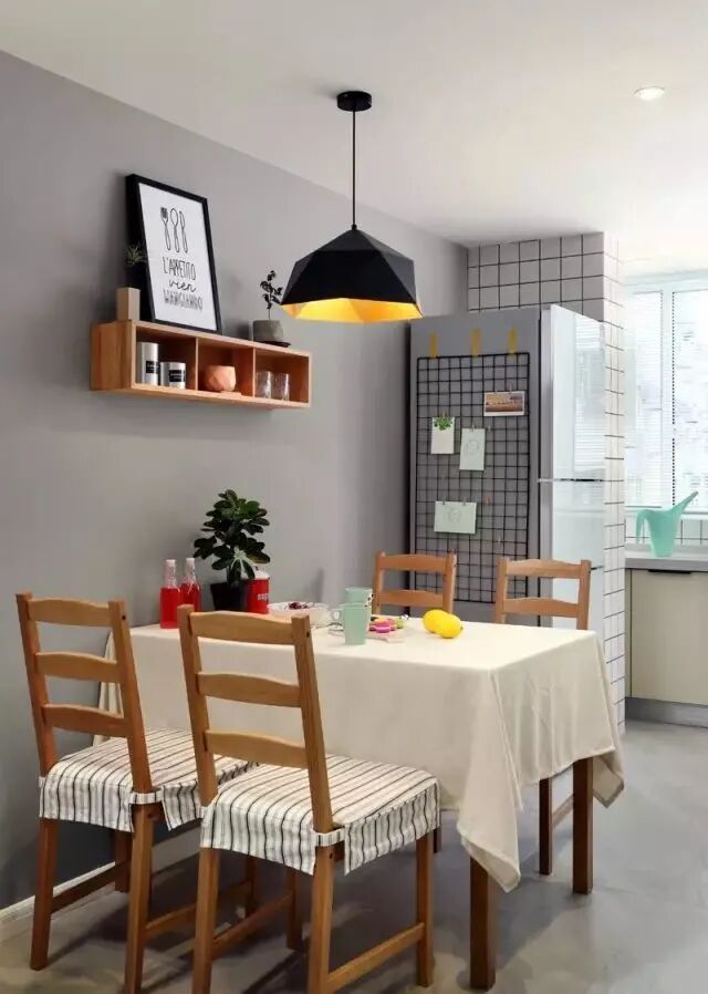 简单的餐桌椅,冰箱放在一边。墙面没有做复杂的设计,直接做小小的壁柜,摆放一些调料或者装饰品,让简单的空间变得更有文艺感。