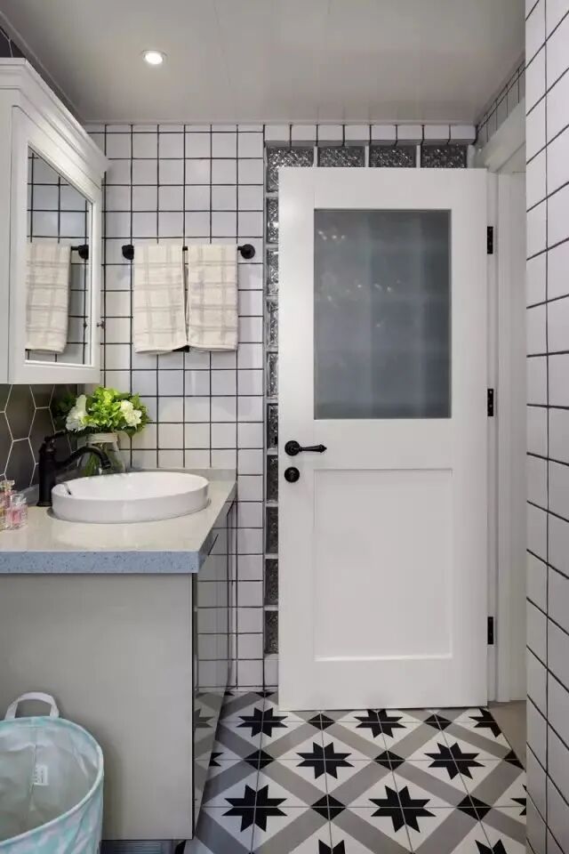 卫生间使用黑白灰调子,显得明亮干脆。蜂窝状的墙砖,不失立体感。