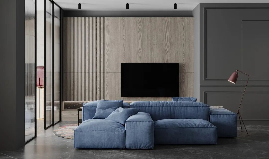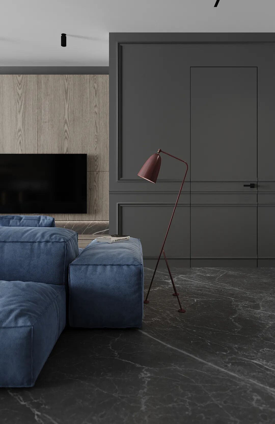设计师特别注重材料选择、纹理组合、颜色搭配与空间氛围的营造。蓝色布艺沙发,木质的电视背景,整个空间层次丰富干净利落,光线充足,呈现出简单而奢华的现代都市风情。