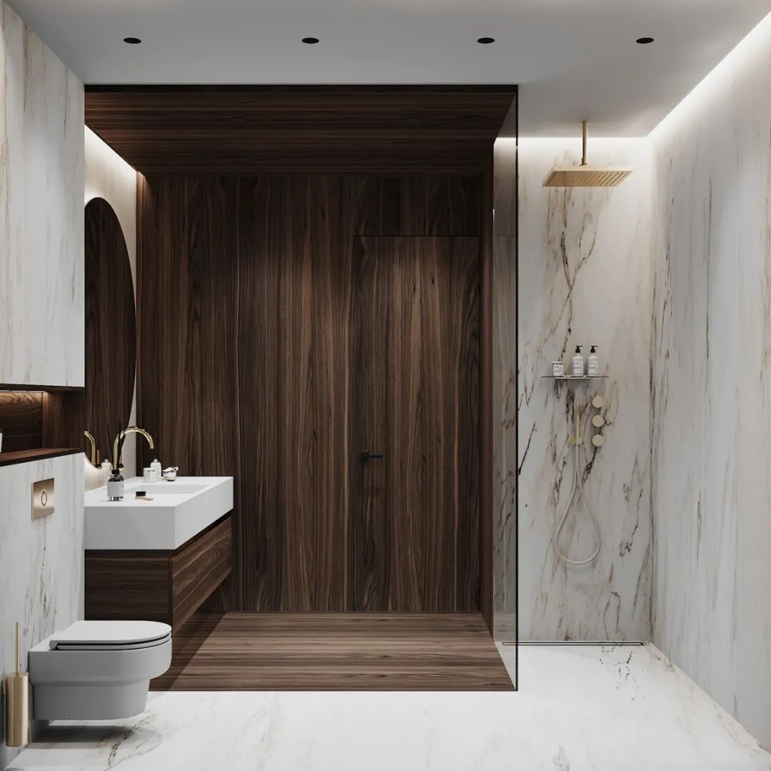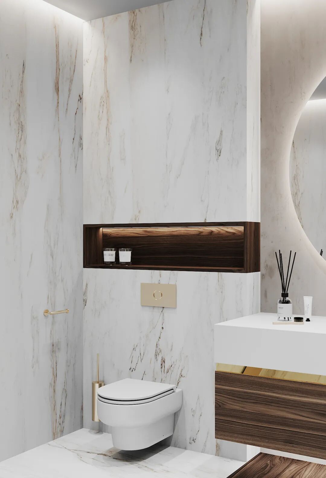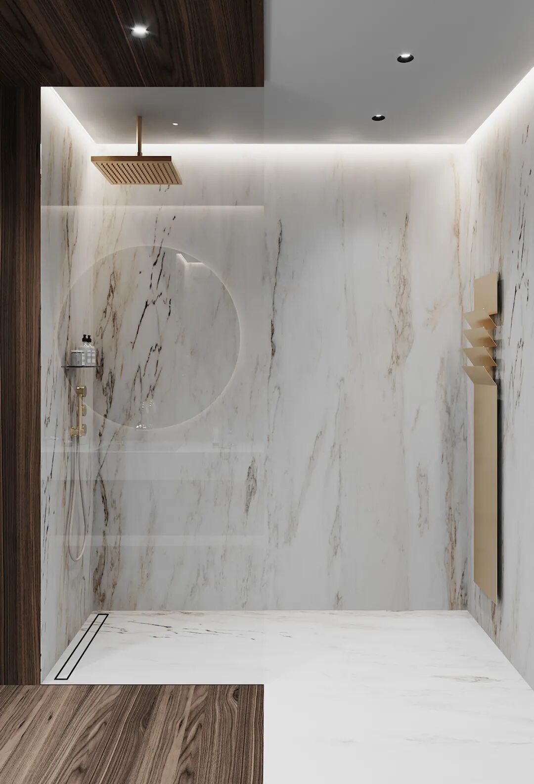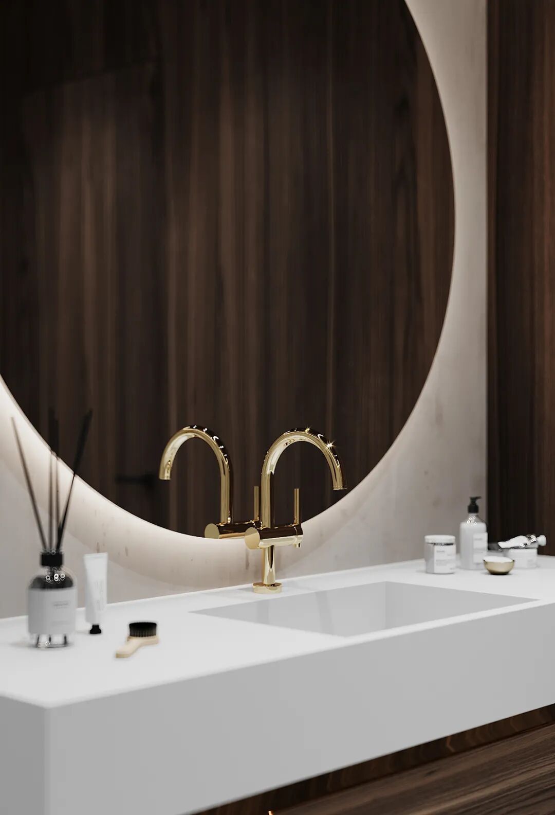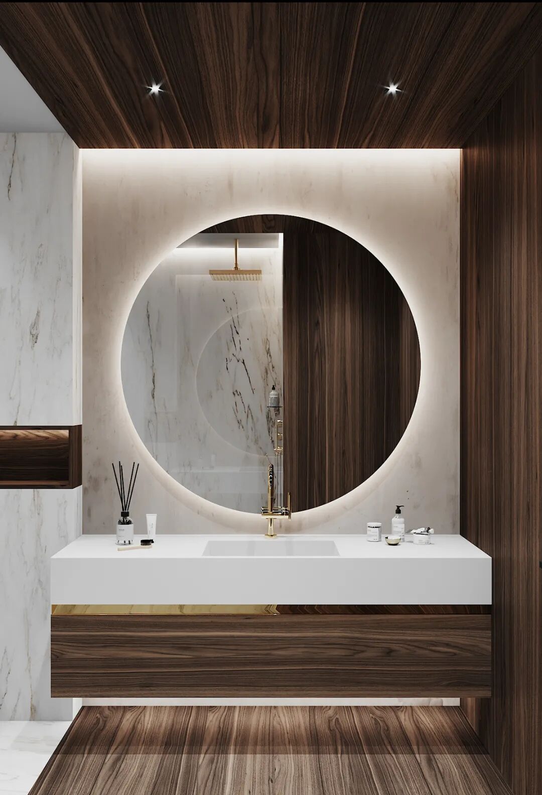 卫生间大理石的纹理完美地结合在一起,金色配件为室内增添更多贵族气息。另一个亮点是圆形照明镜,它使室内看起来更宽敞。