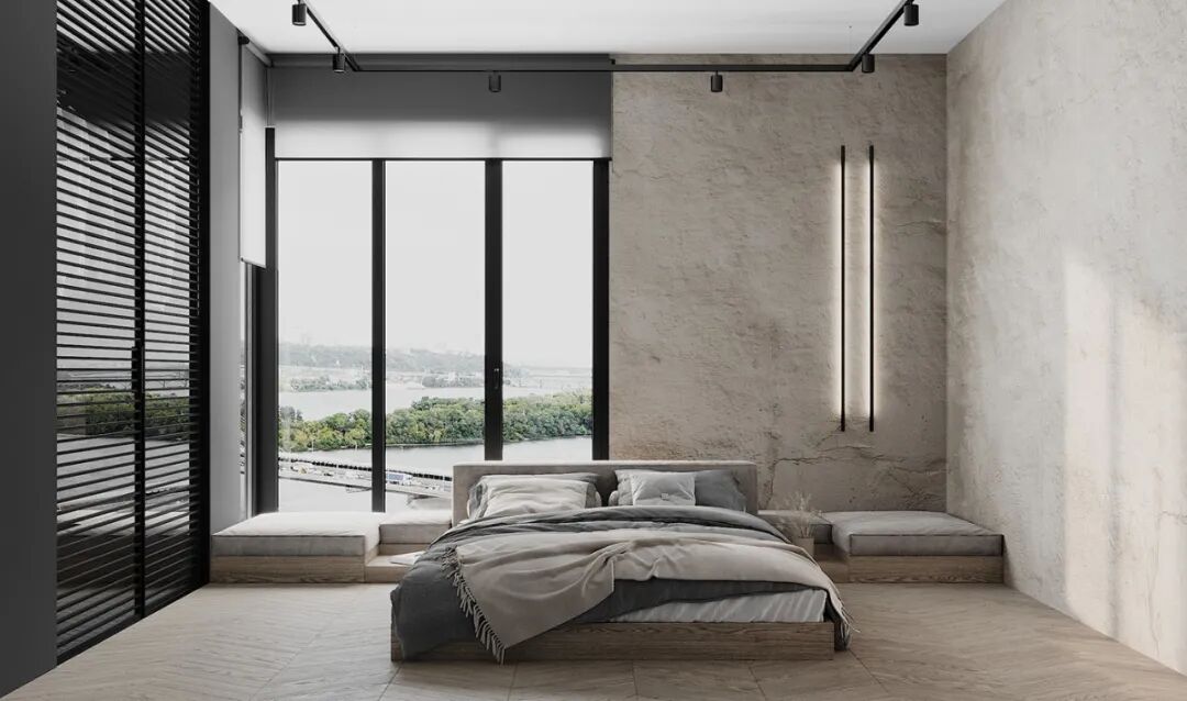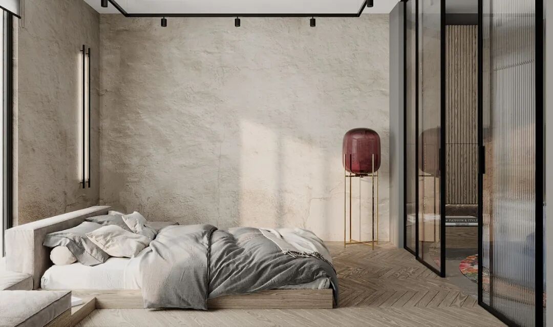宽敞明亮的卧室,这个是一个非常受人喜爱的空间,柔和的色调,自然的质感,对“虚实相生”的元素灵活加以运用,泥土质感背景墙设计打造出独一无二的造型。